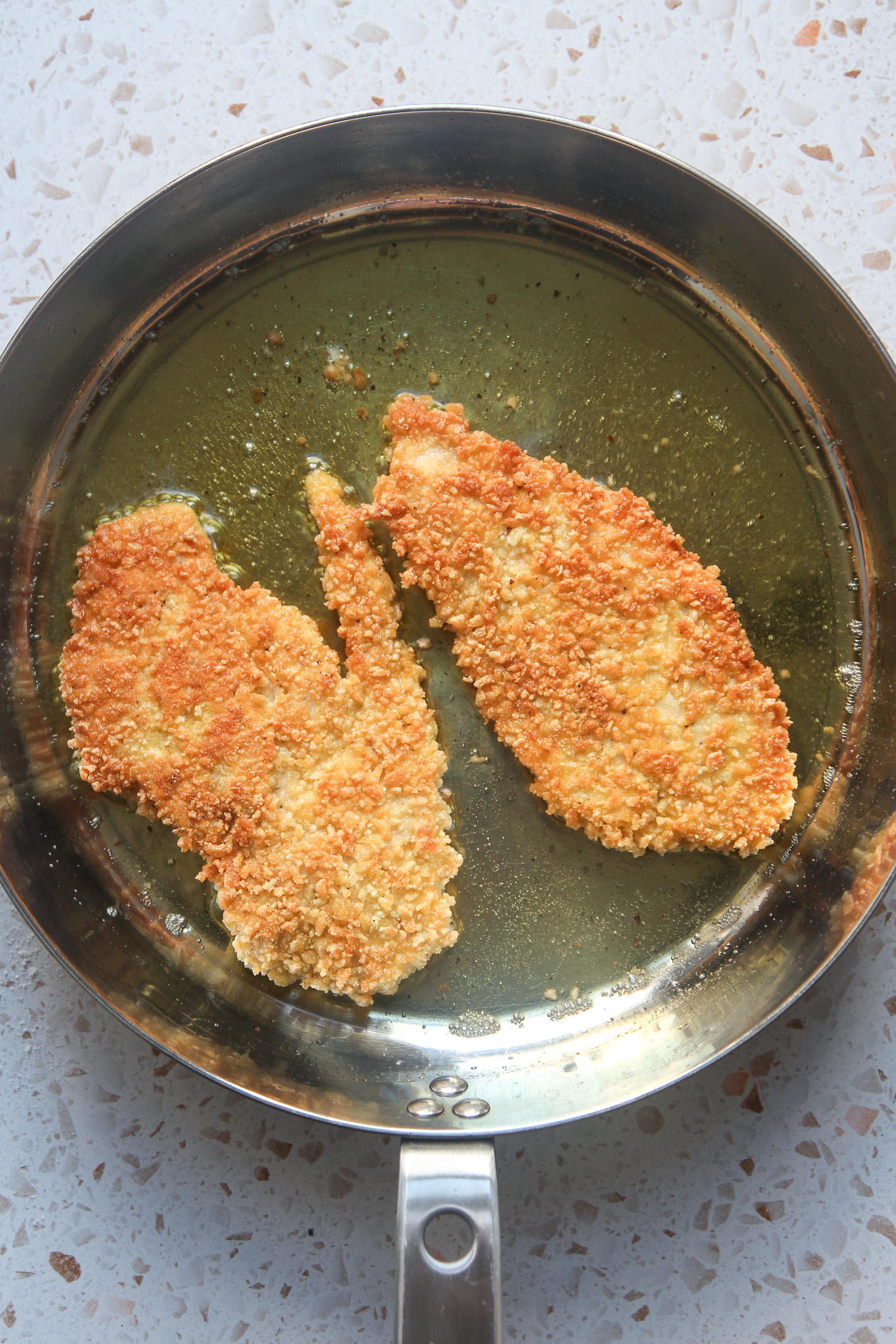 - Carefully transfer the breaded cutlets to the pan, frying two at a time to avoid overcrowding the pan. Fry the cutlets for 3-5 minutes per side or until they are golden brown and the internal temperature reads 165℉. Transfer the cooked cutlets to the prepared rack to drain off any excess oil. Repeat with the remaining cutlets, adding extra oil to the pan between batches, if needed.