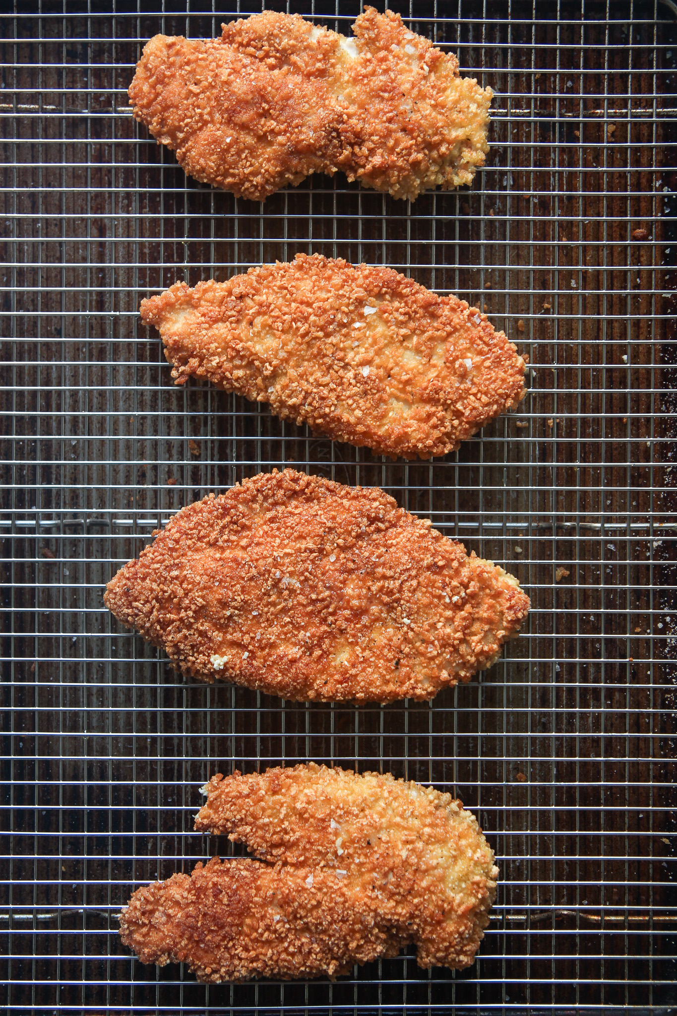Carefully transfer the breaded cutlets to the pan, frying two at a time to avoid overcrowding the pan. Fry the cutlets for 3-5 minutes per side or until they are golden brown and the internal temperature reads 165℉. Transfer the cooked cutlets to the prepared rack to drain off any excess oil. Repeat with the remaining cutlets, adding extra oil to the pan between batches, if needed.
