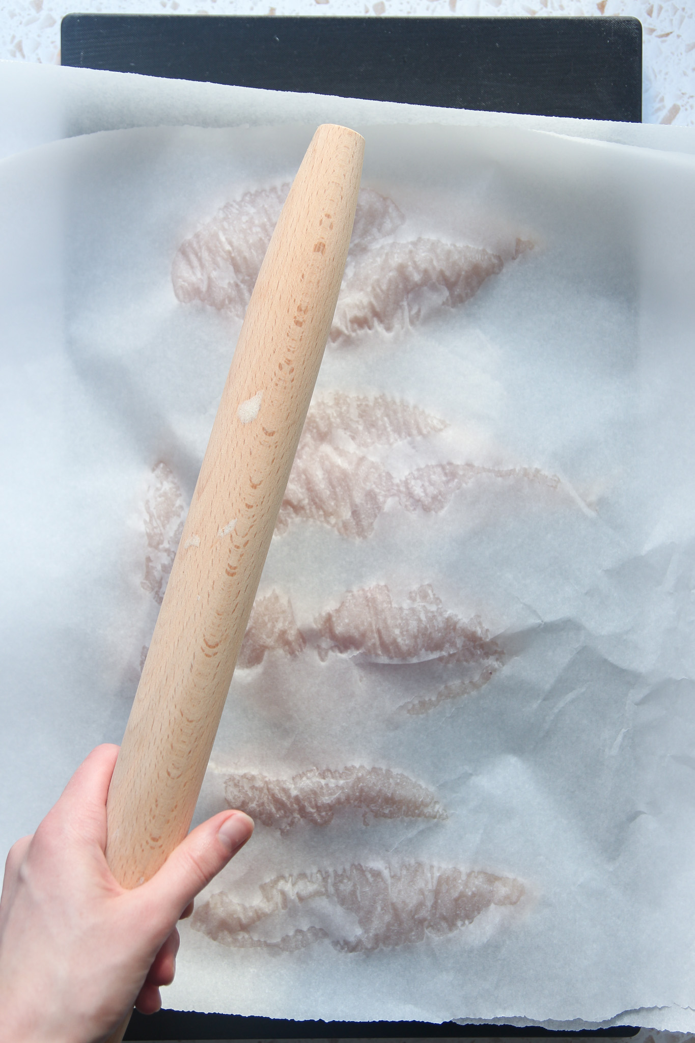 - Lay the cutlets out flat on a cutting board between two pieces of parchment paper. Use a meat mallet to flatten the cutlets until they are a uniform thickness of about half an inch.