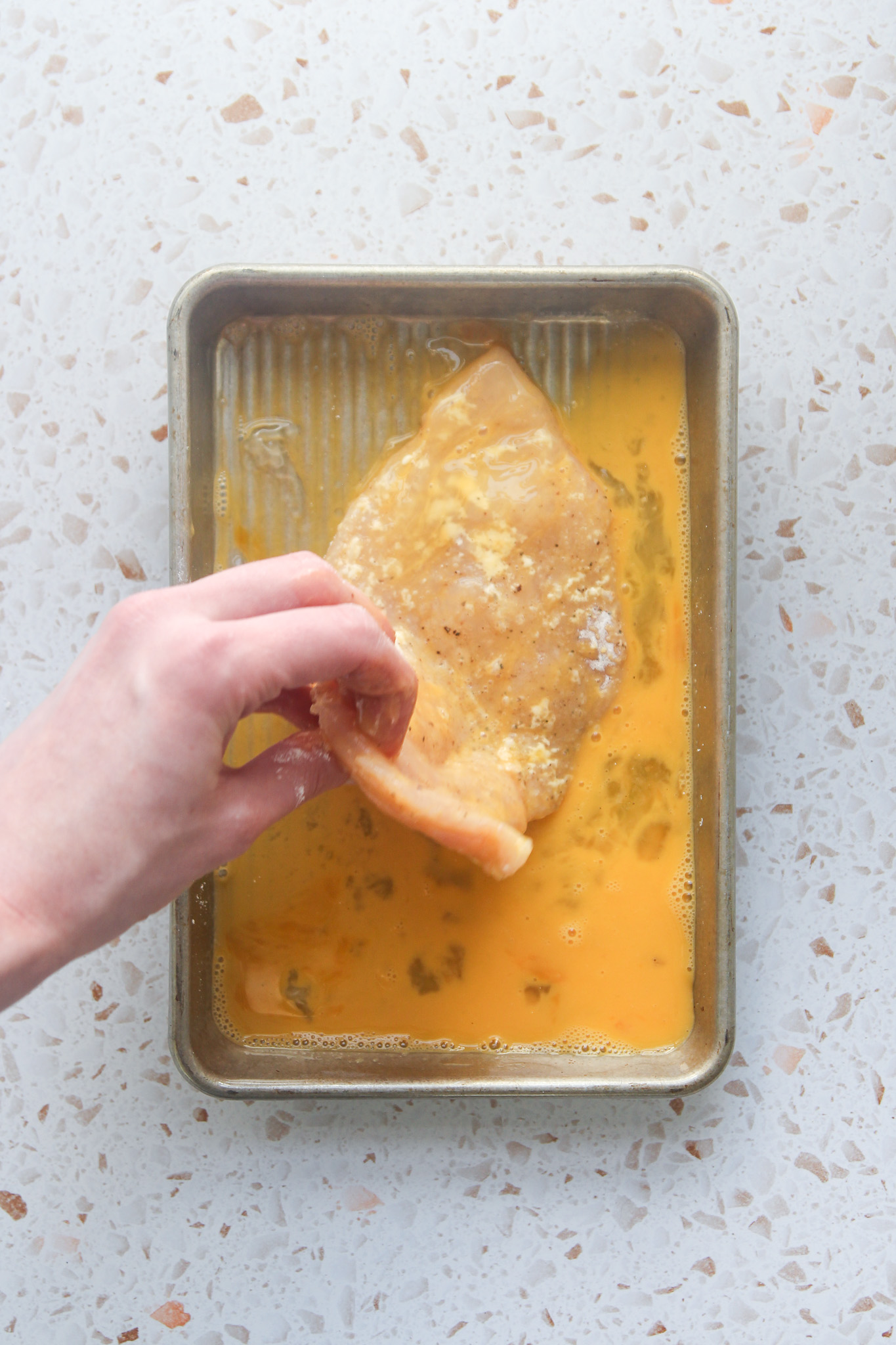 - Line a large baking sheet with parchment and set aside while you bread the chicken cutlets. Working with one cutlet at a time, dredge the cutlet through the flour, making sure to coat all sides. Shake off any excess flour before moving the cutlet to the bowl of beaten eggs. Dredge the cutlet through the egg, coating all sides, letting the excess egg run off. Lastly, dredge the cutlet through the Panko, coating all sides. Transfer the breaded cutlet to the lined baking sheet. Repeat with the remaining cutlets.