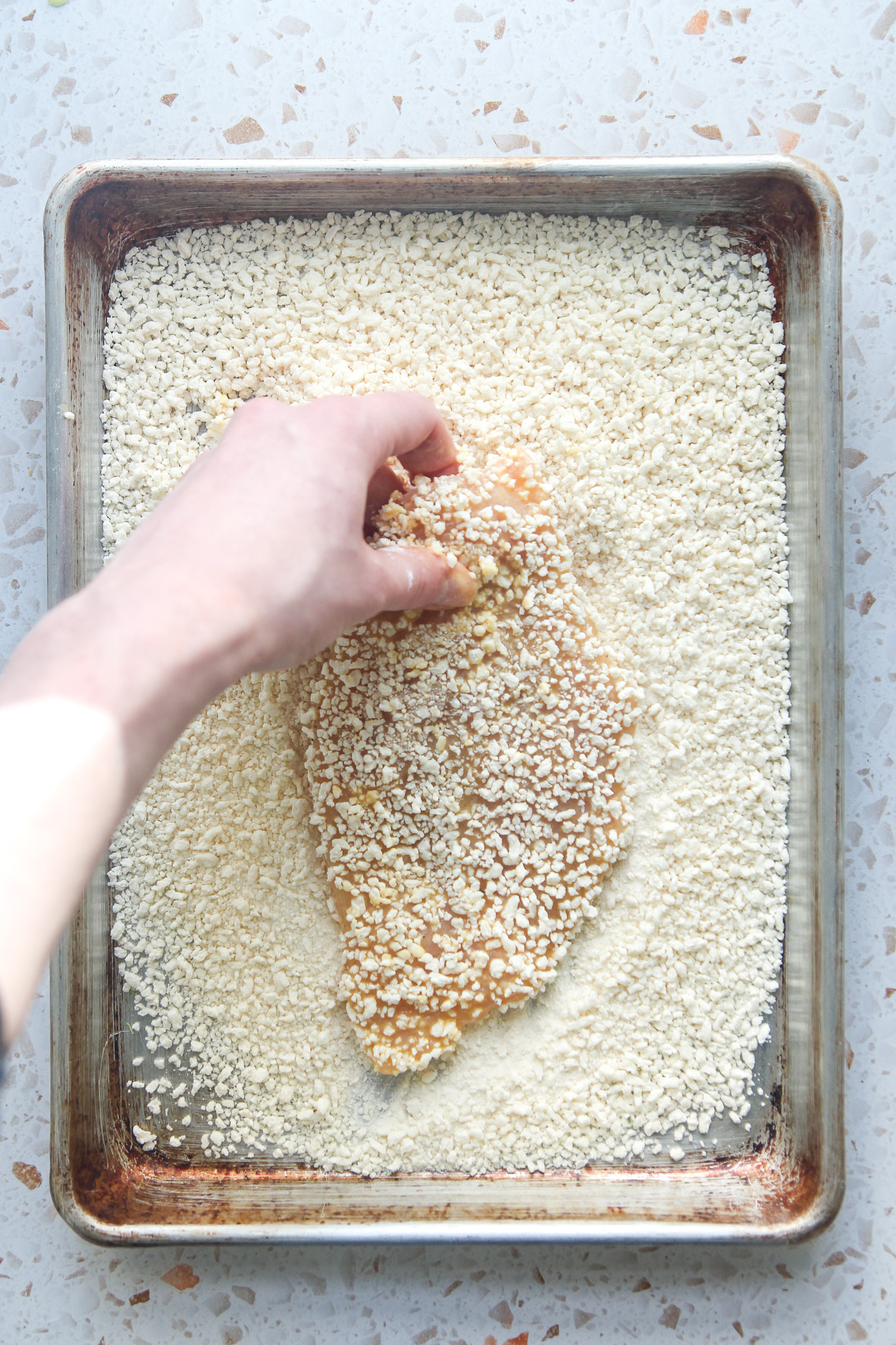 Working with one cutlet at a time, dredge the cutlet through the flour, making sure to coat all sides. Shake off any excess flour before moving the cutlet to the bowl of beaten eggs. Dredge the cutlet through the egg, coating all sides, letting the excess egg run off. Lastly, dredge the cutlet through the panko, coating all sides. Transfer the breaded cutlet to the lined baking sheet.