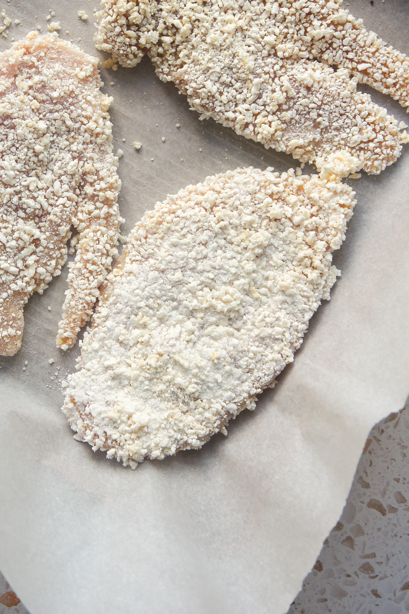 Lay the cutlets out flat on a cutting board between two pieces of parchment paper. Use a meat mallet to flatten the cutlets until they are a uniform thickness of about half an inch.