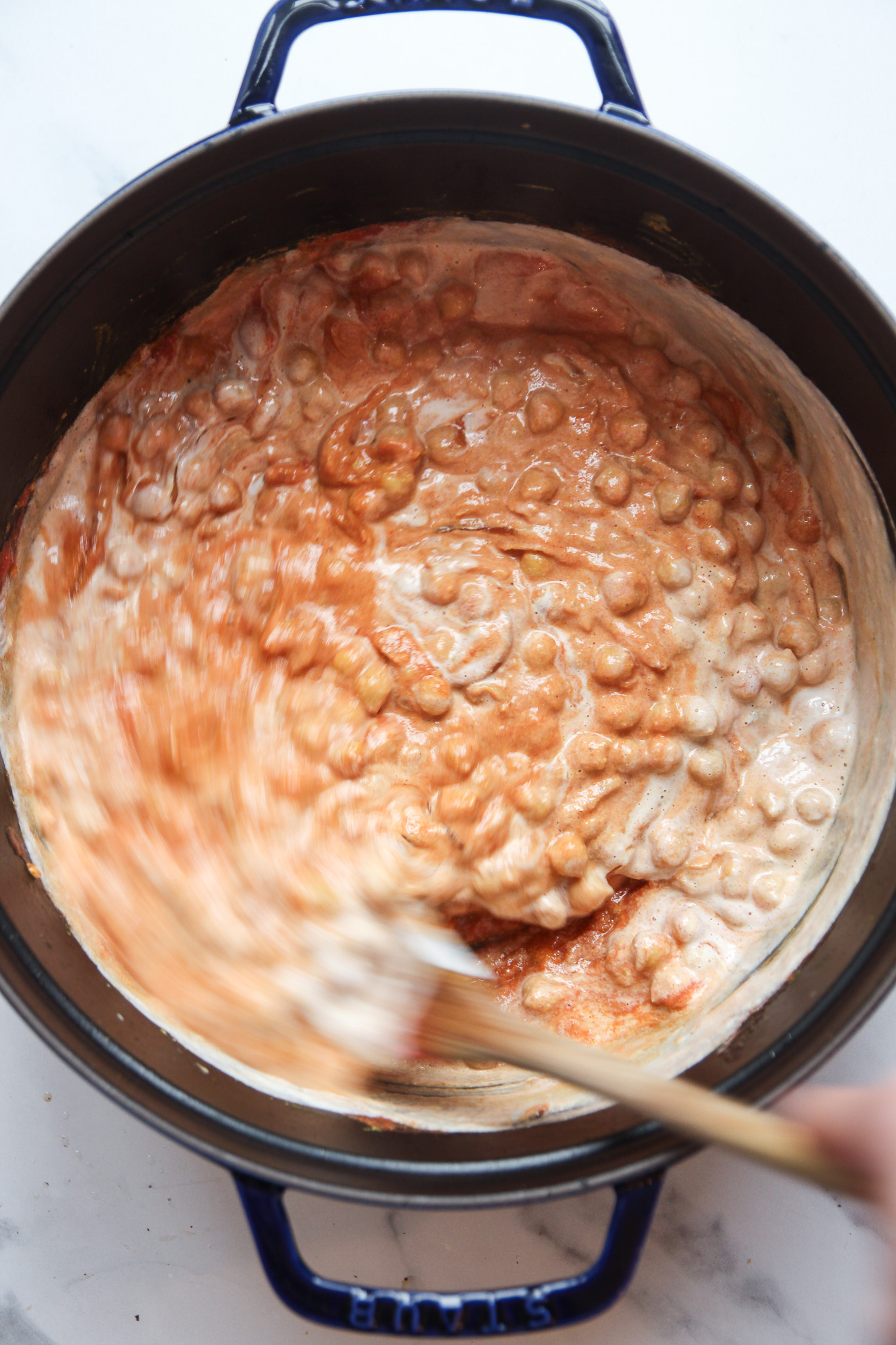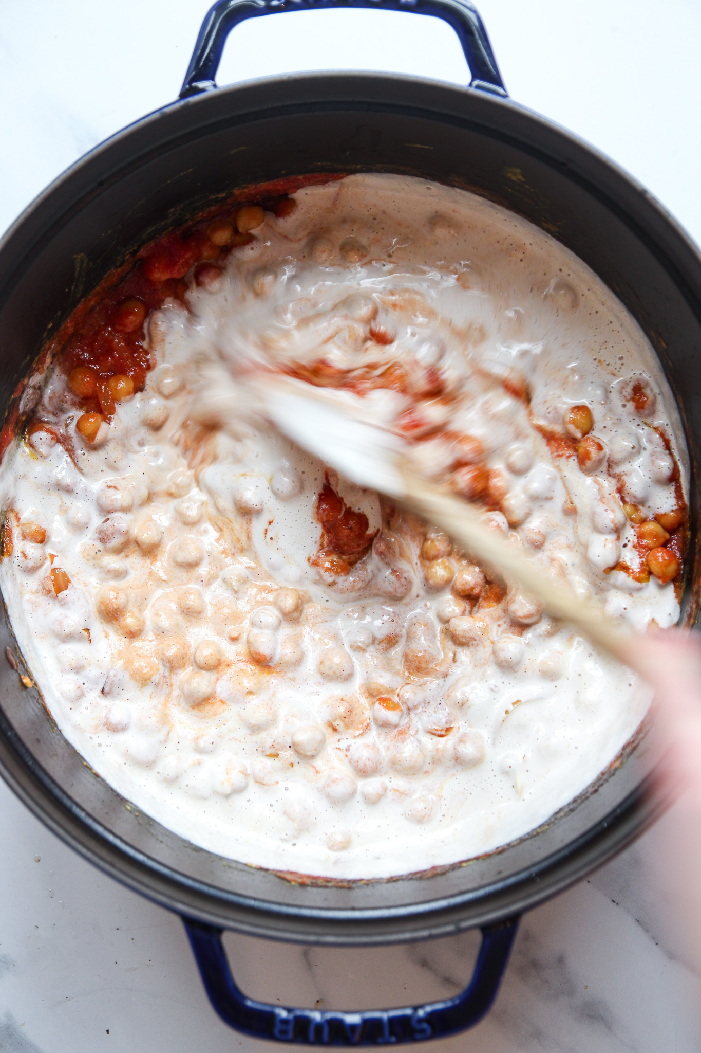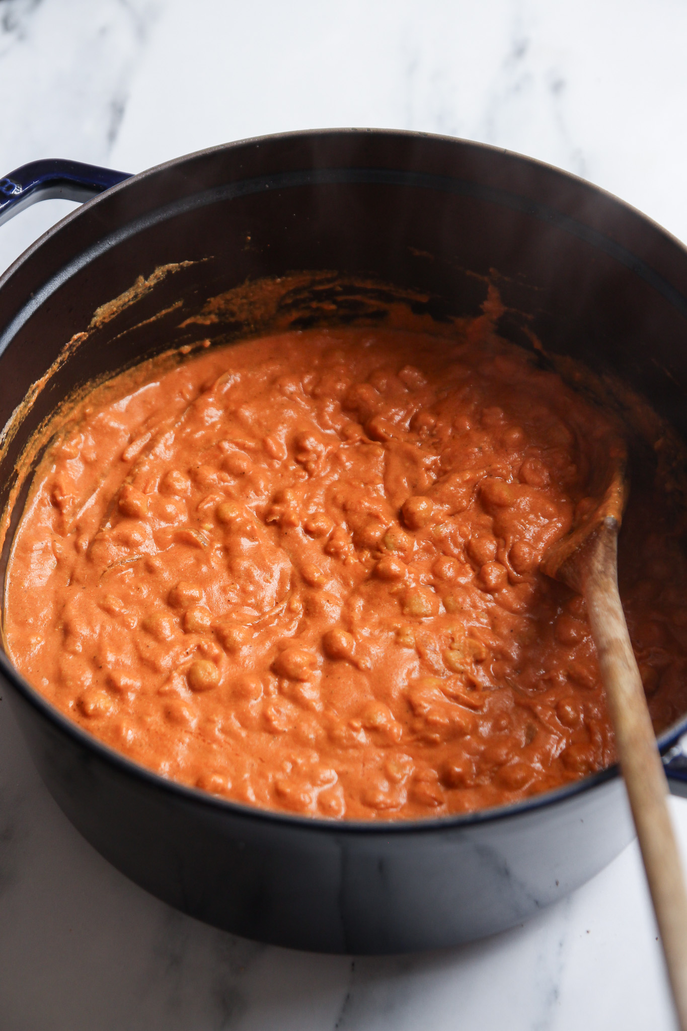 - Pour in the passata and cashew cream, stirring to combine, then stir the coconut sugar into the sauce. Bring the butter chickpeas to a boil, then reduce to a simmer, cover, and cook for 20 minutes. Stirring often to avoid burning. If your sauce feels too thick, you can add a bit of water to loosen it.