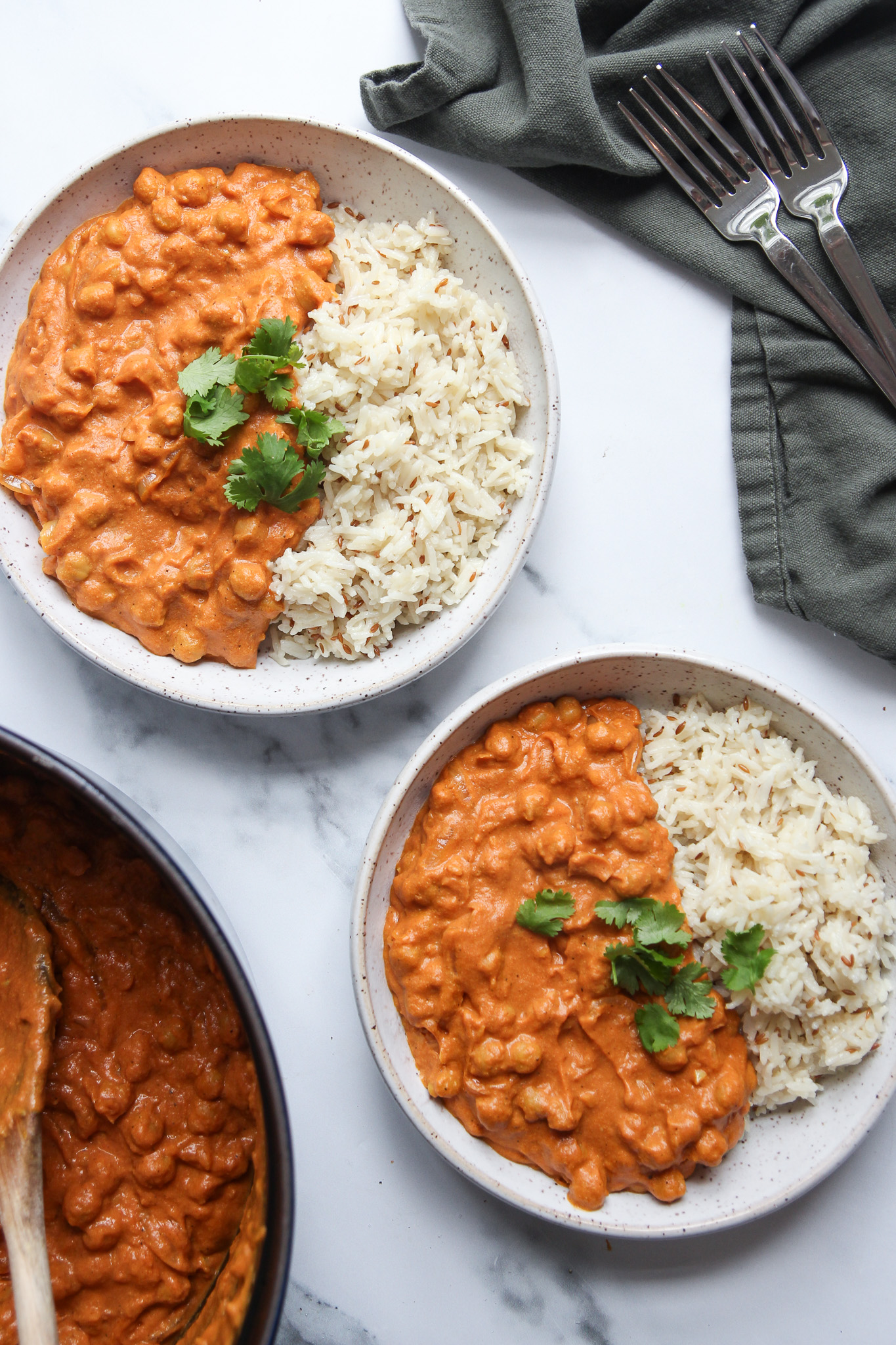 Serve the butter chickpeas with rice, warm naan bread, and fresh cilantro.