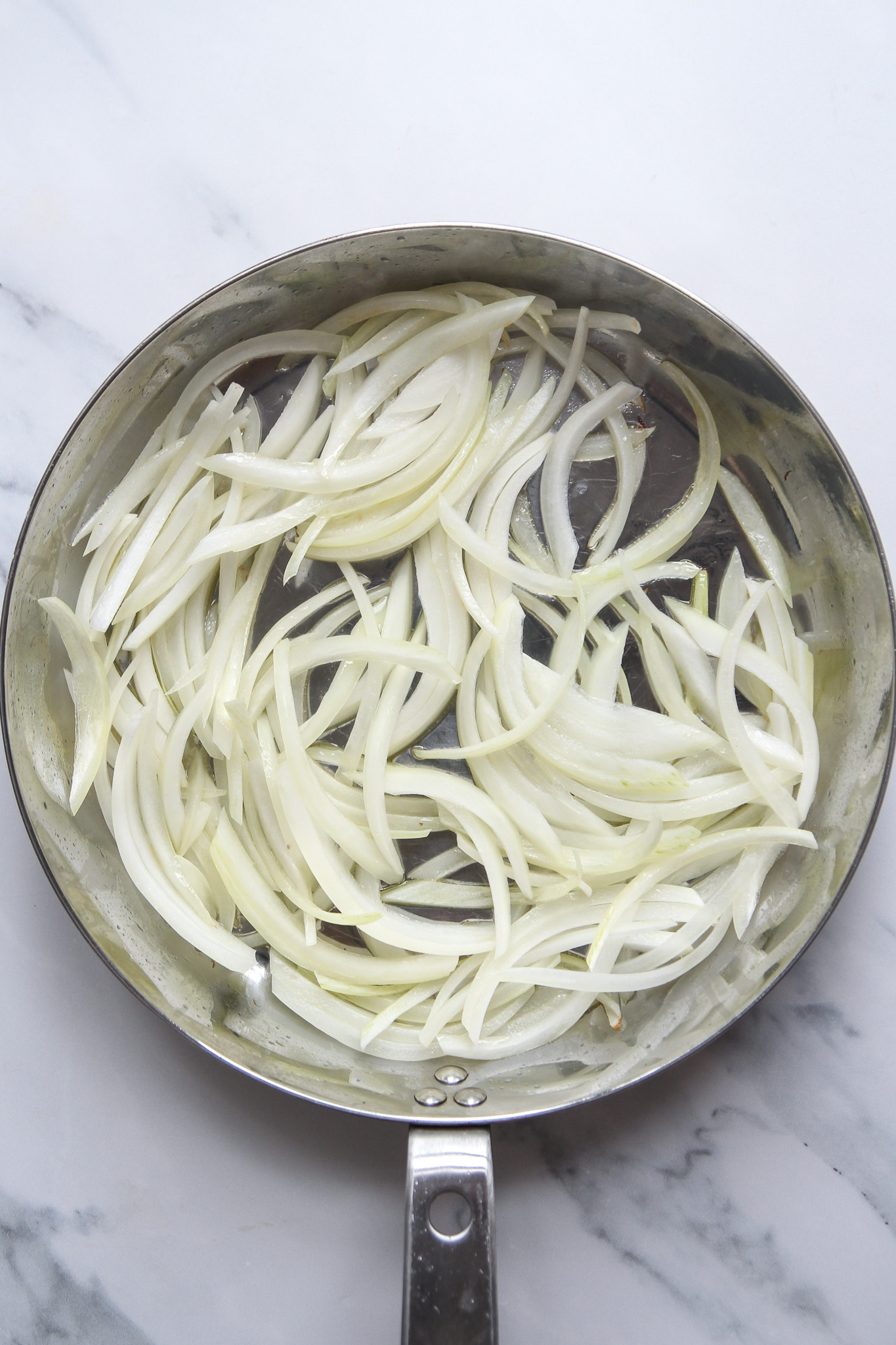 - Heat a large frying pan over medium-low heat. While the pan is heating, thinly slice the onion. Add the olive oil to the heated pan and swirl to coat. Add the sliced onions.