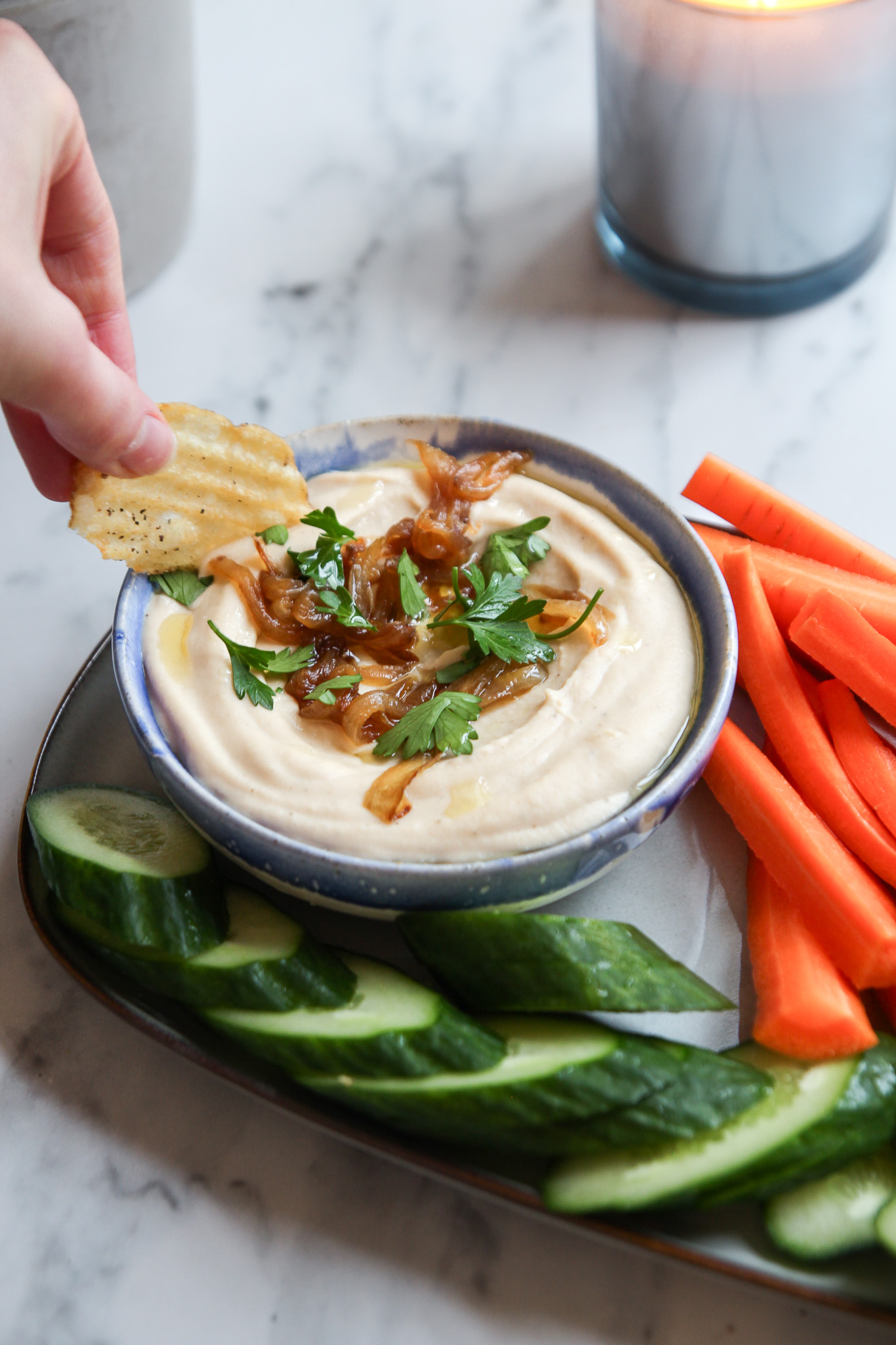 - Transfer the dip to a serving dish, garnish with the reserved caramelized onions, a drizzle of olive oil, and some fresh parsley. The dip will keep in an airtight container in the fridge for up to a week.