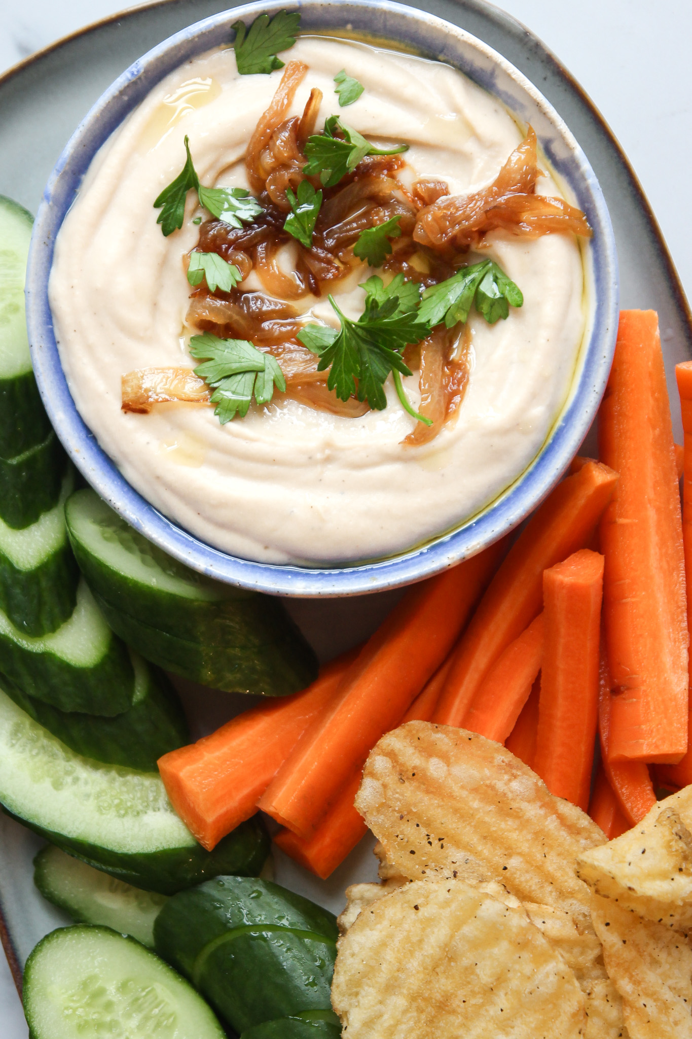 Transfer the dip to a serving dish, garnish with the reserved caramelized onions, a drizzle of olive oil, and some fresh parsley. The dip will keep in an airtight container in the fridge for up to a week.