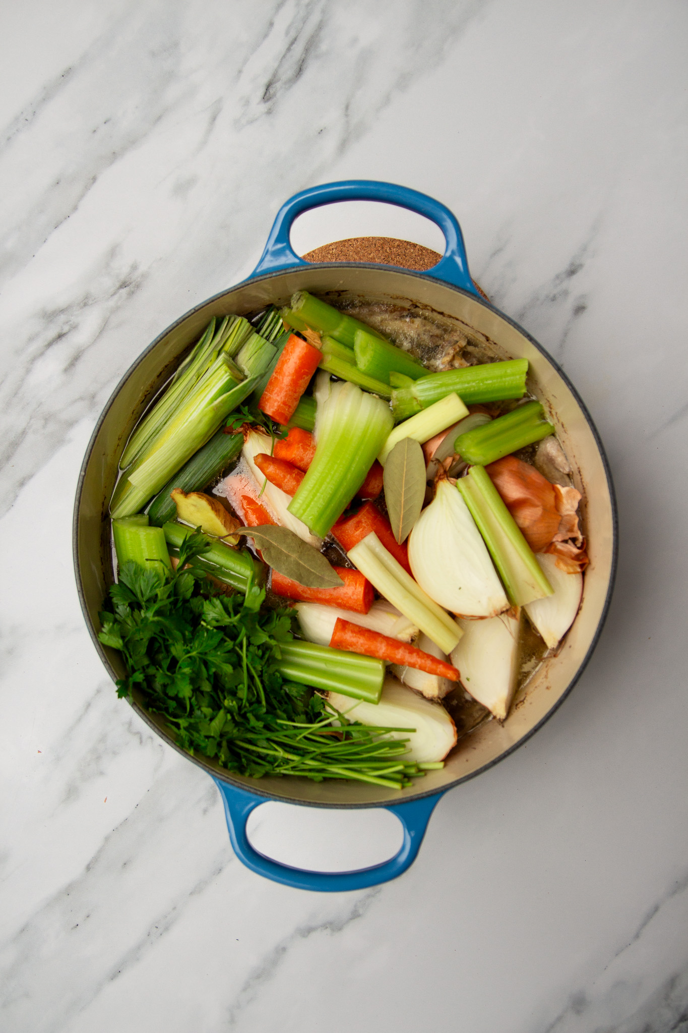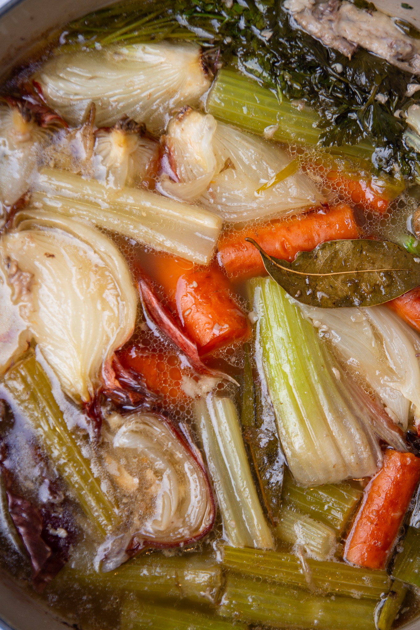 Once the broth has been simmering for four hours, add in the aromatic vegetables, whole peppercorns, and bay leaves. Stir well to disperse the vegetables evenly then simmer for a further three to four hours.