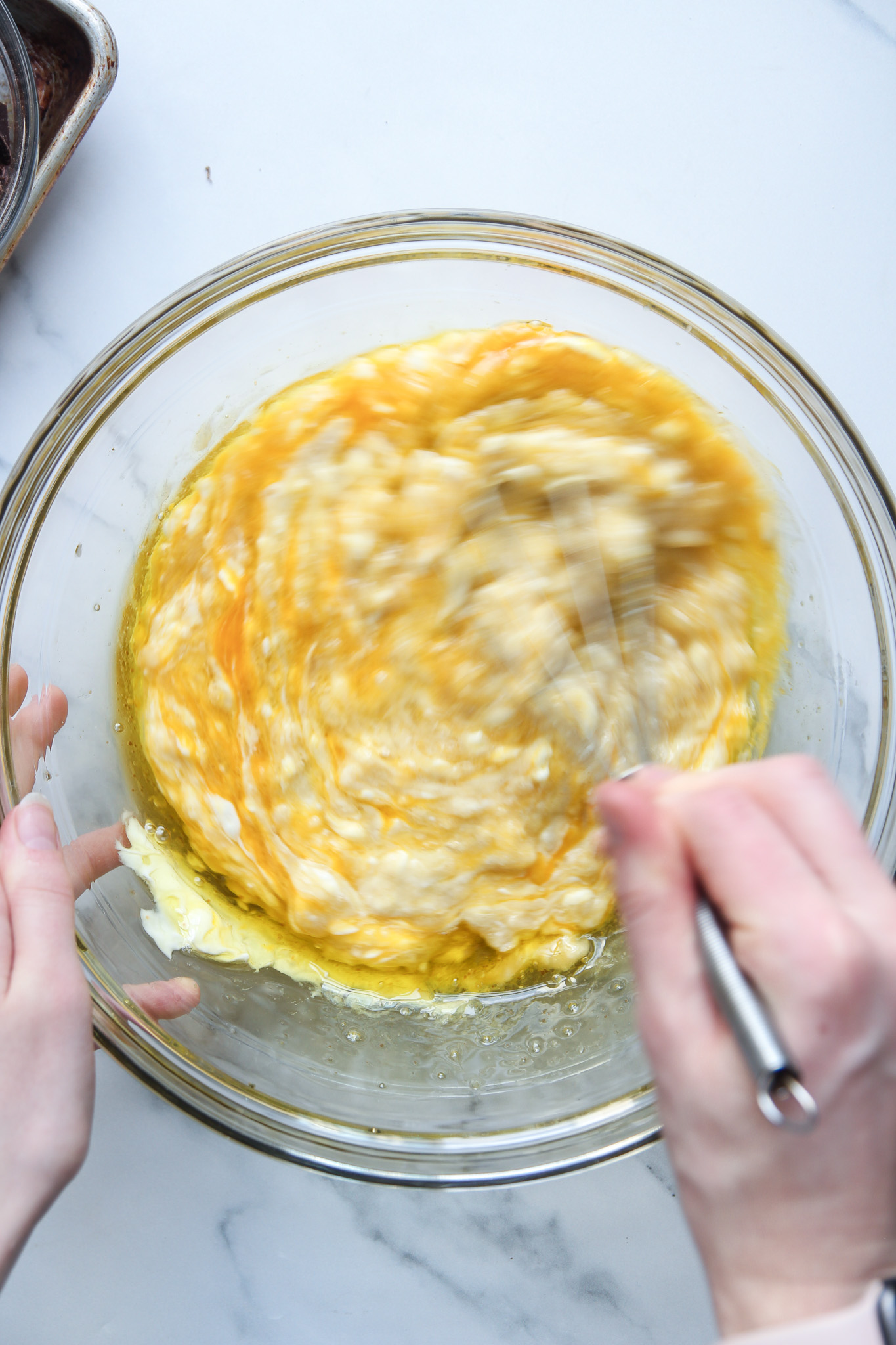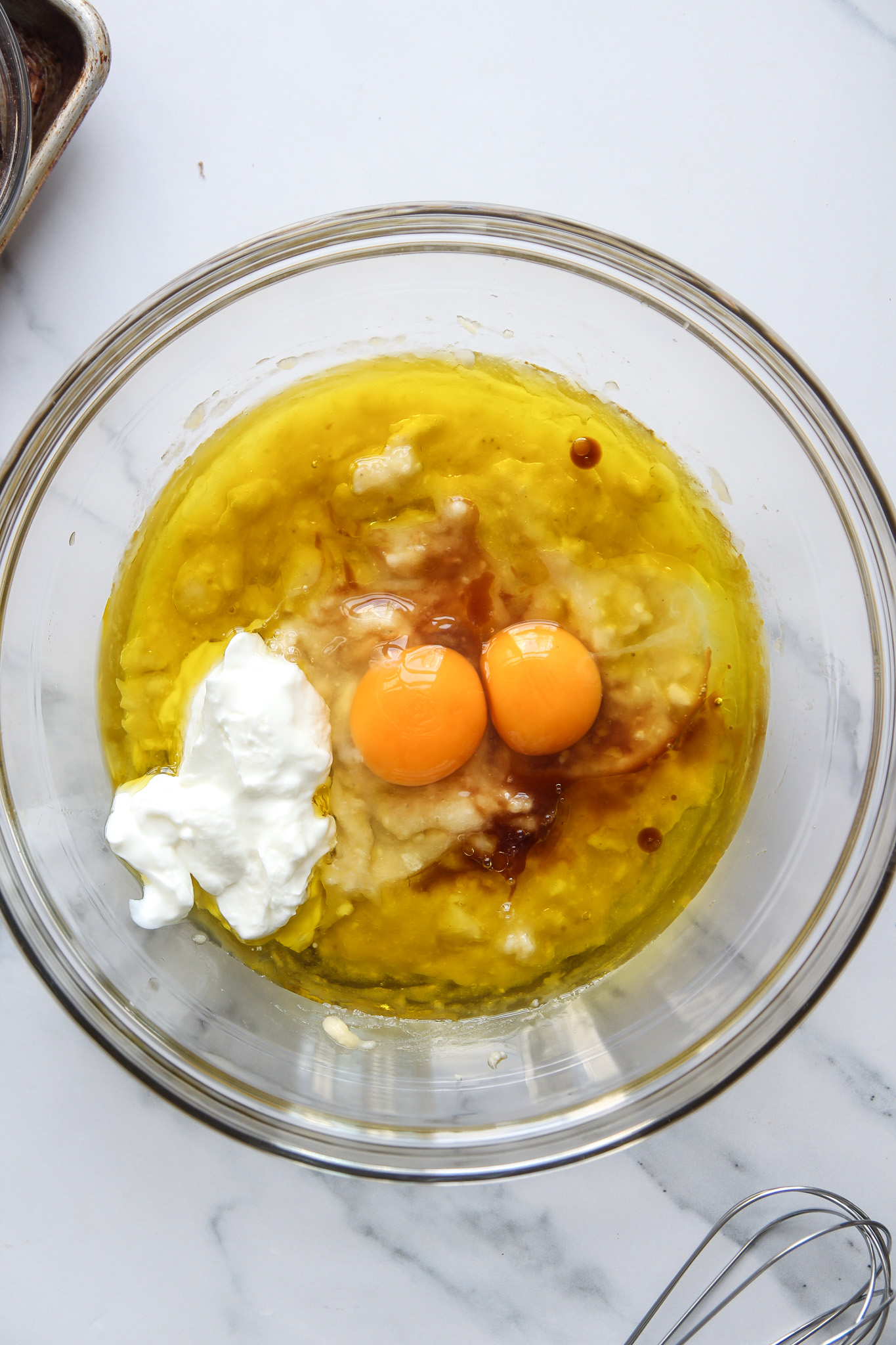 - In a large mixing bowl, mash the ripe banana until smooth. Add the yogurt, olive oil, eggs, vanilla extract, and coconut sugar, then whisk well to combine. Set aside.