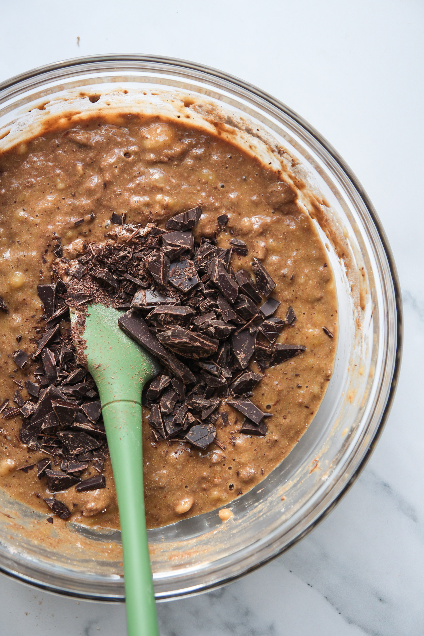 - Using a baking spatula, fold the dry ingredients into the wet until just combined. Add the roughly chopped chocolate to the bowl and give the batter a couple of folds with the baking spatula to incorporate.