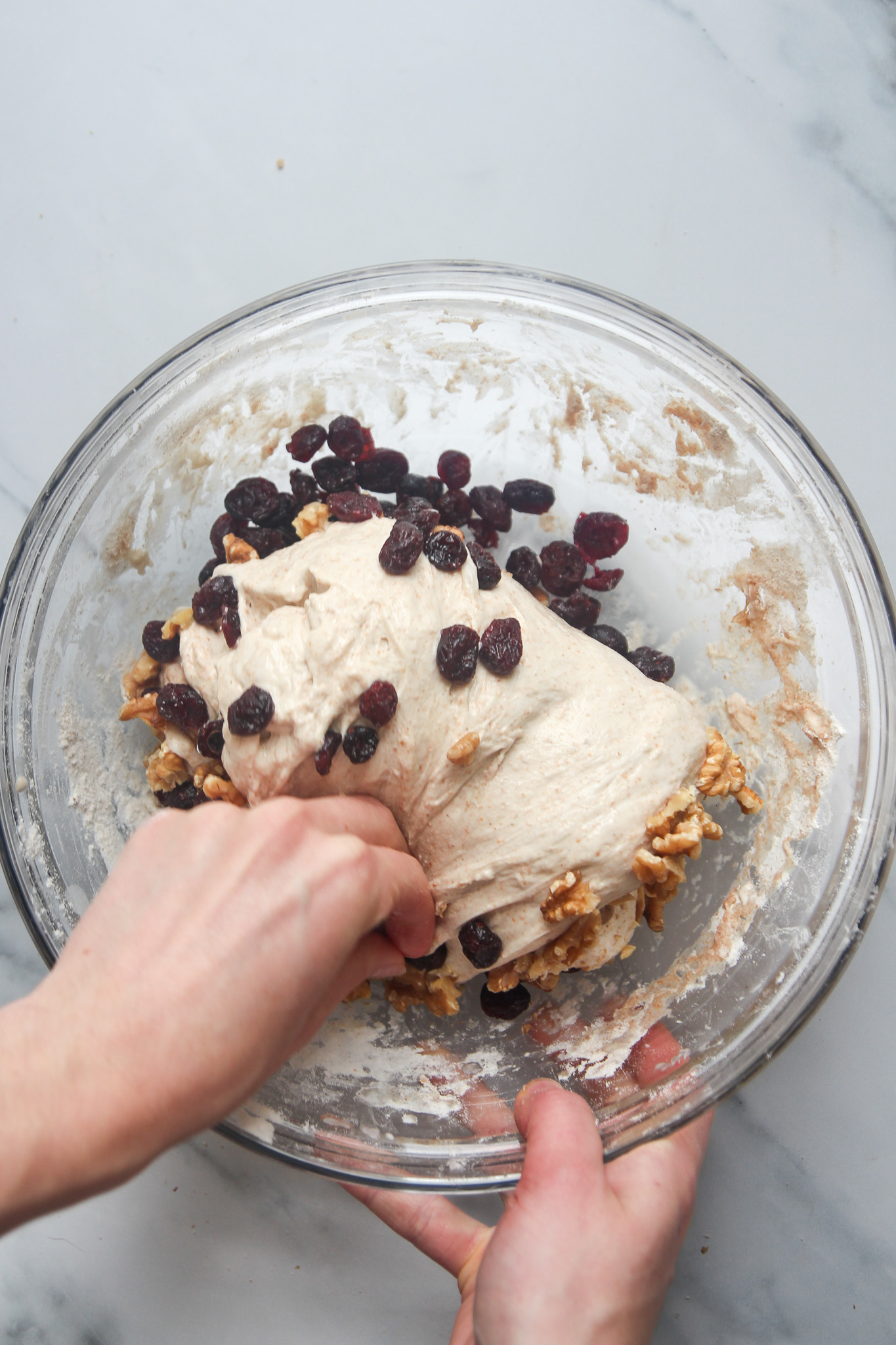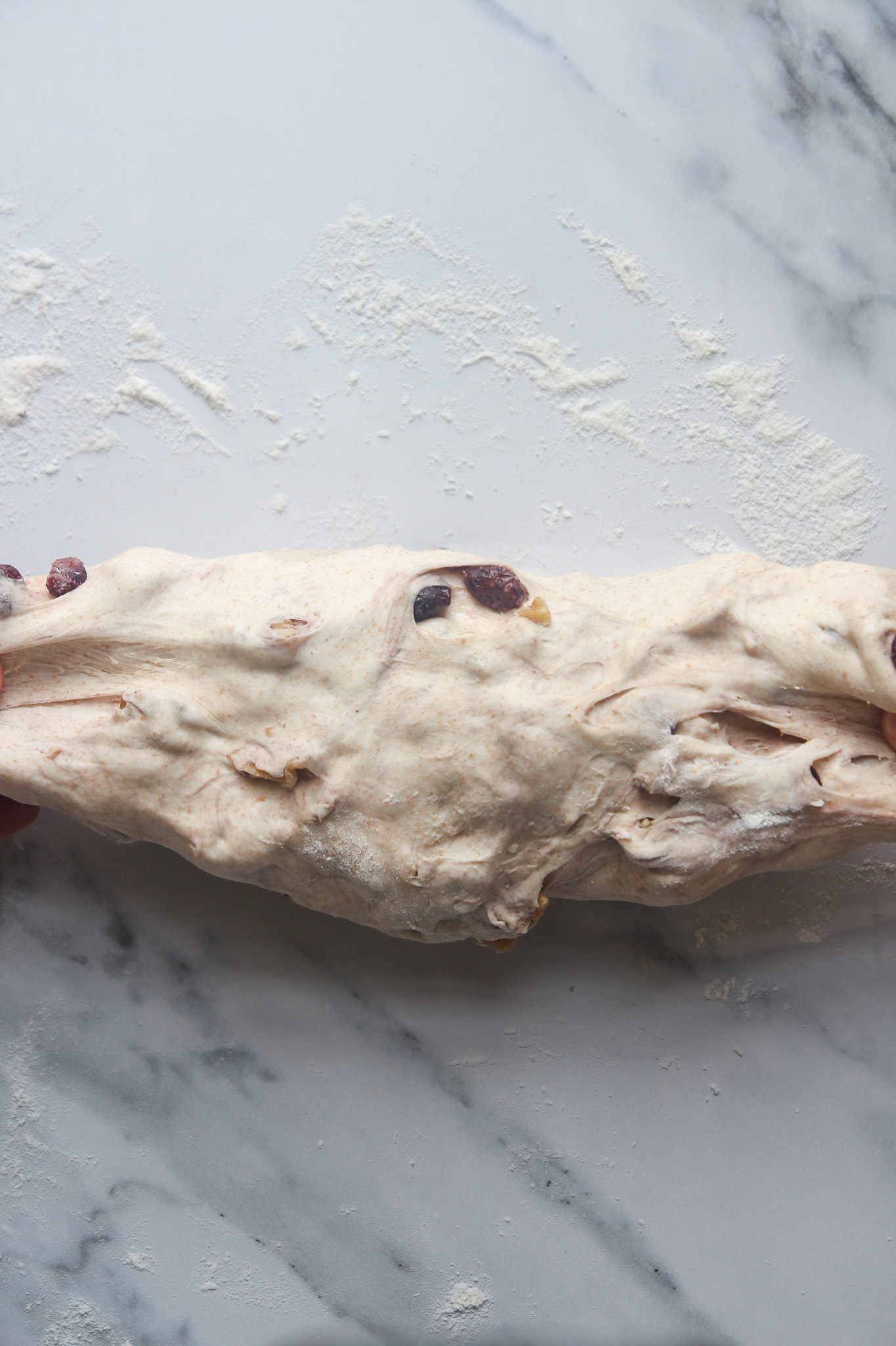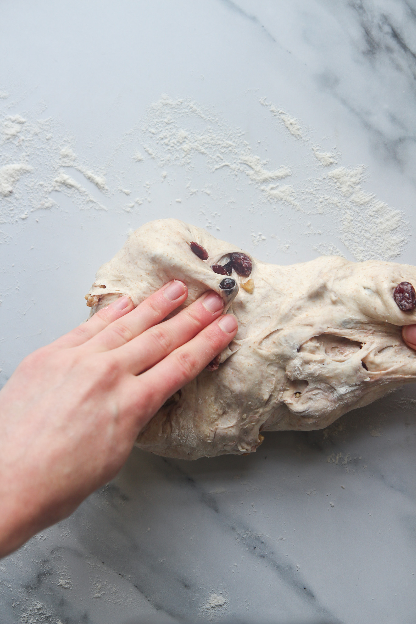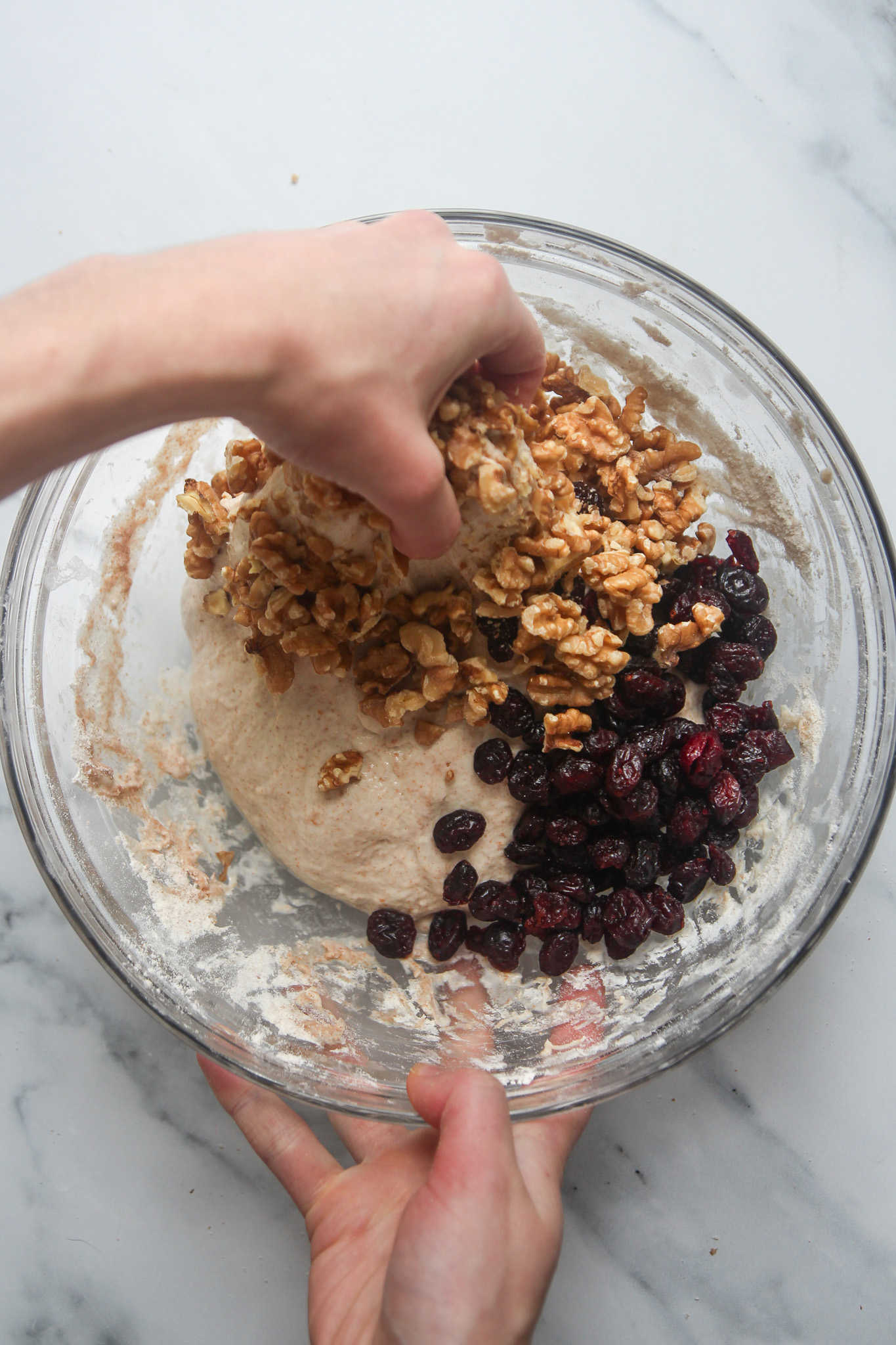 - On the second envelope fold—30 minutes into the bulk fermentation—add the cranberries and walnuts. Complete the fold as normal to begin incorporating the cranberries and walnuts. Do not worry if they do not look well incorporated after this initial turn. As you complete the remaining turns over the course of the bulk fermentation, the cranberries and walnuts will become more incorporated.