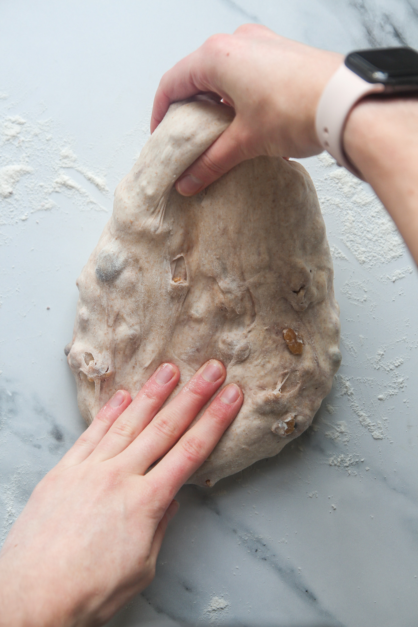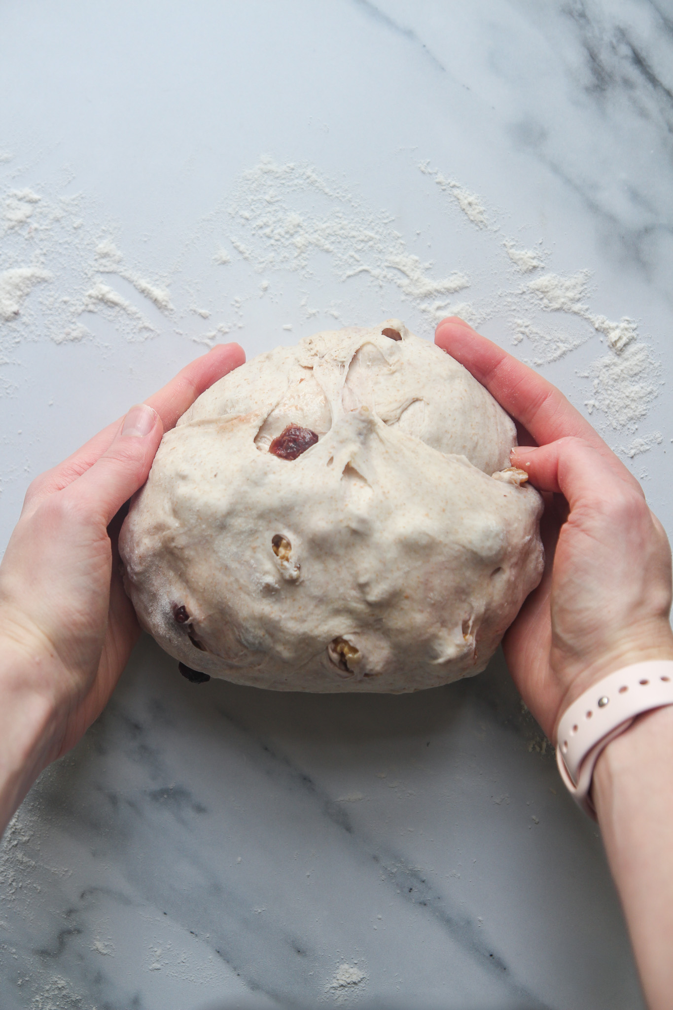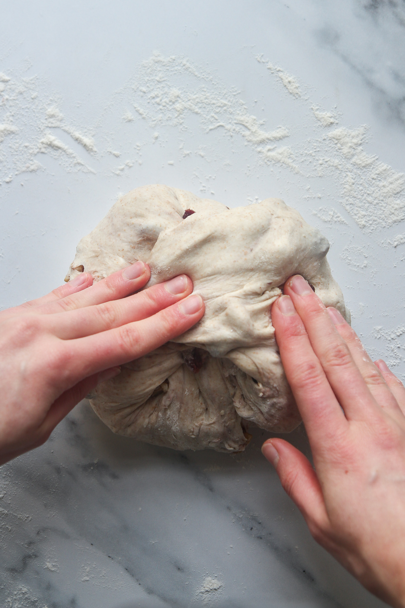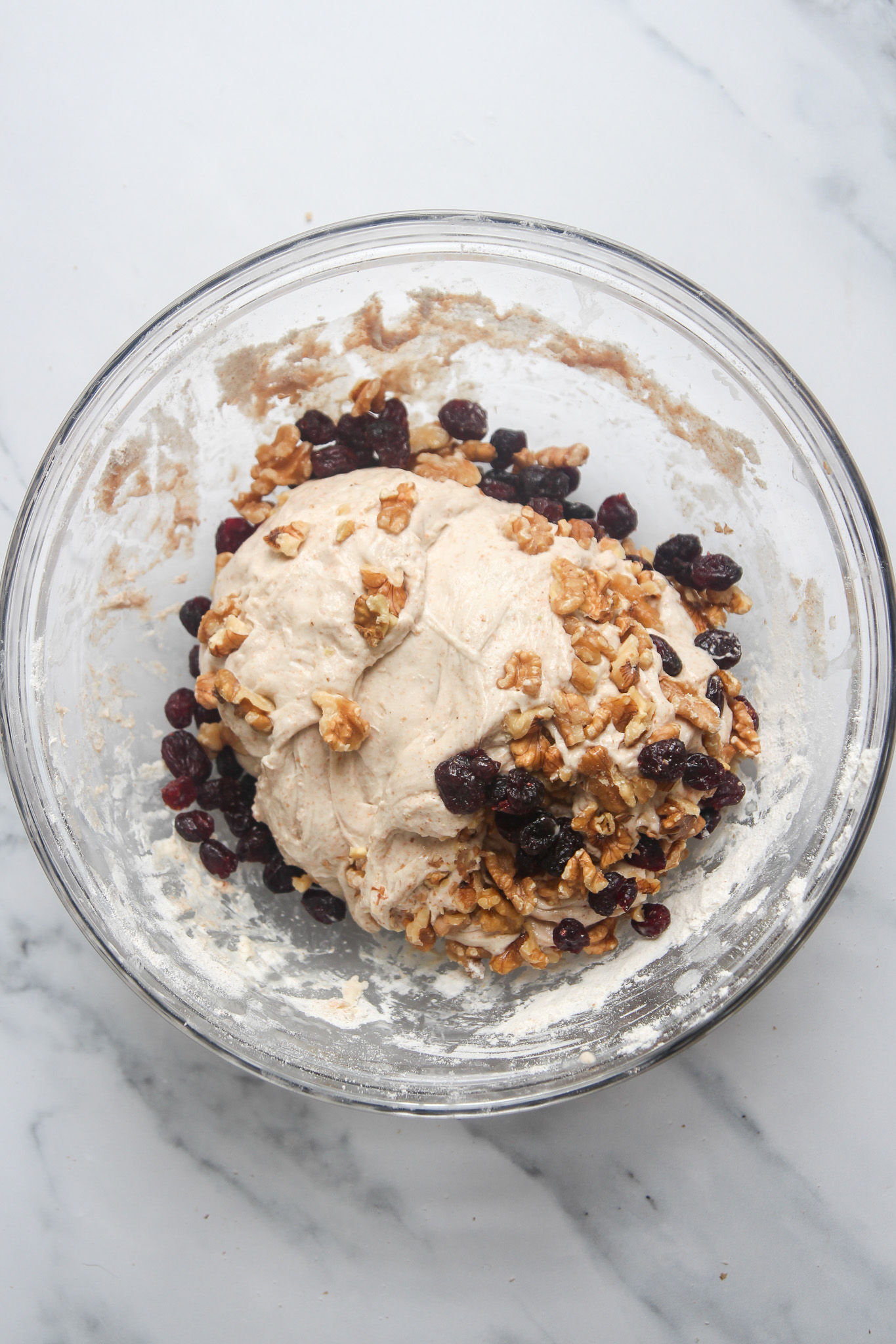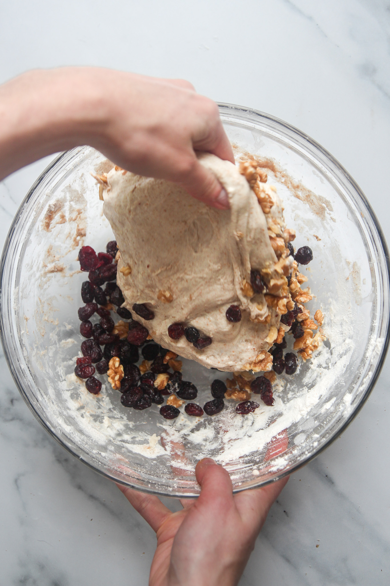 - On the second envelope fold—30 minutes into the bulk fermentation—add the cranberries and walnuts. Complete the fold as normal to begin incorporating the cranberries and walnuts. Do not worry if they do not look well incorporated after this initial turn. As you complete the remaining turns over the course of the bulk fermentation, the cranberries and walnuts will become more incorporated.