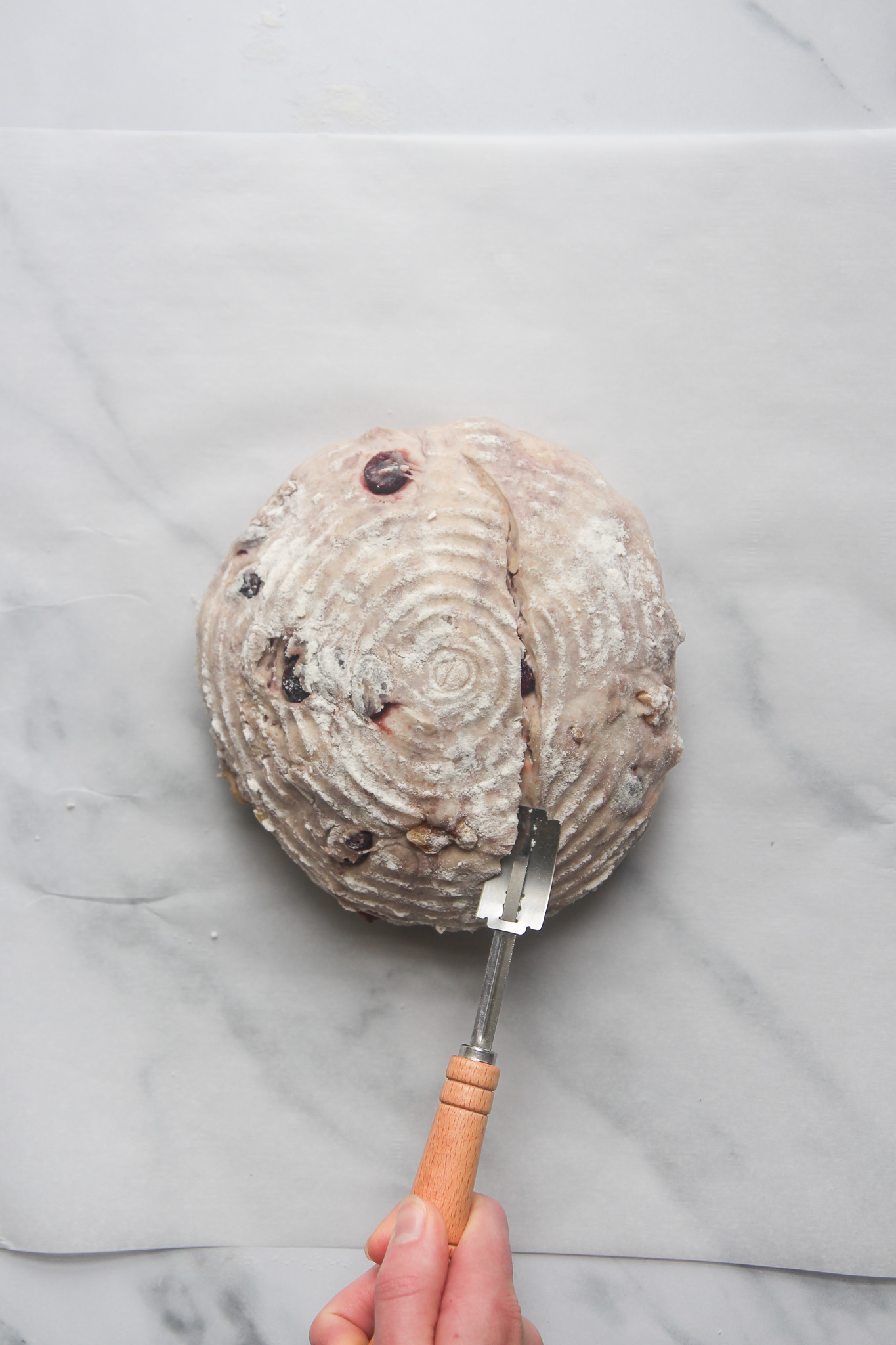 - Flip the loaf out onto a square of parchment. Using a sharp bread lame, carefully score the loaf with your desired pattern. A singular line across the middle or a square on the surface of the dough works best, in my experience.