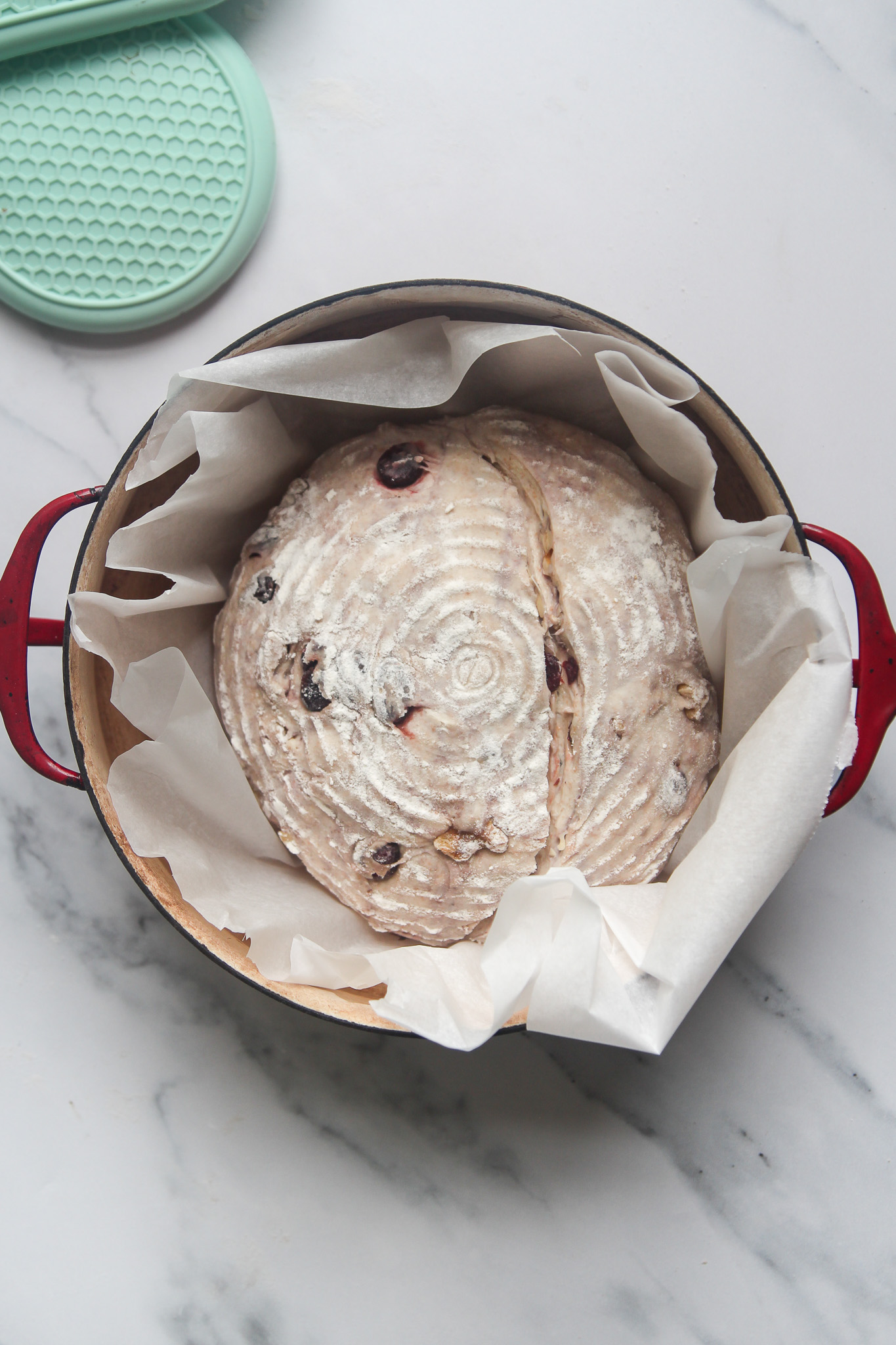 - Using heavyweight oven mitts, carefully remove the preheated Dutch oven from the oven. Carefully transfer the scored loaf into the Dutch oven and cover with the lid. Reduce the oven temperature to 450℉ and bake the loaf covered for 20 minutes.