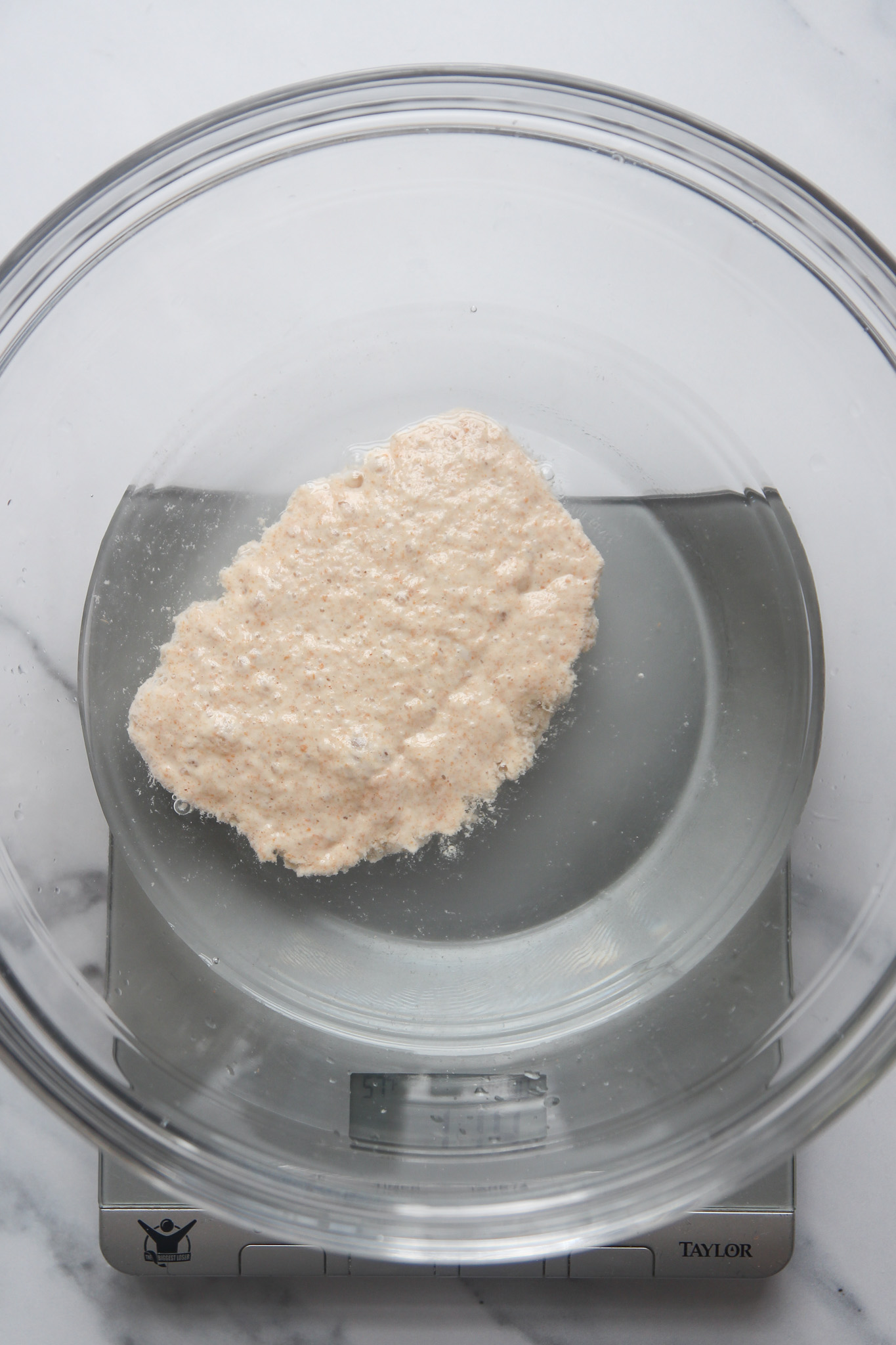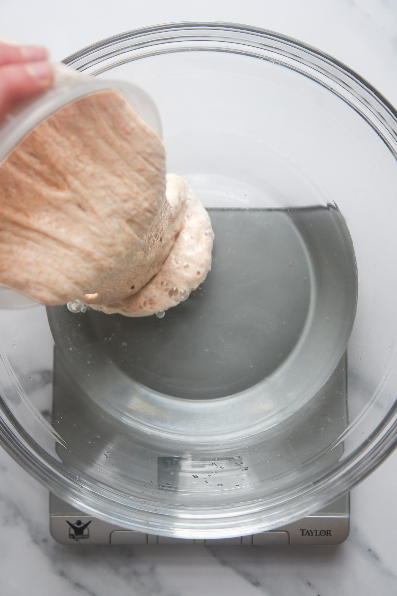 - Add 300 grams of the warm water to a large mixing bowl. Add 100 grams of the leaven; the remaining leaven will become your new starter, and stir well to disperse.