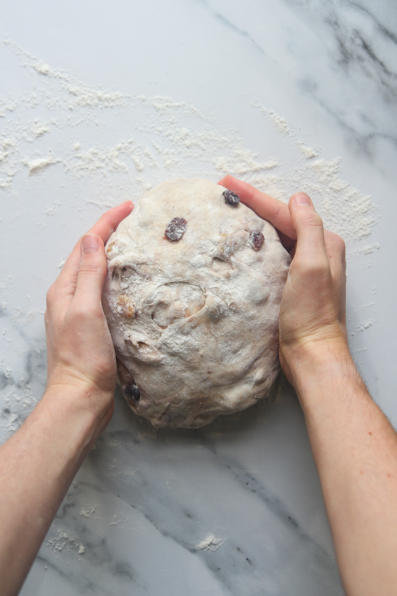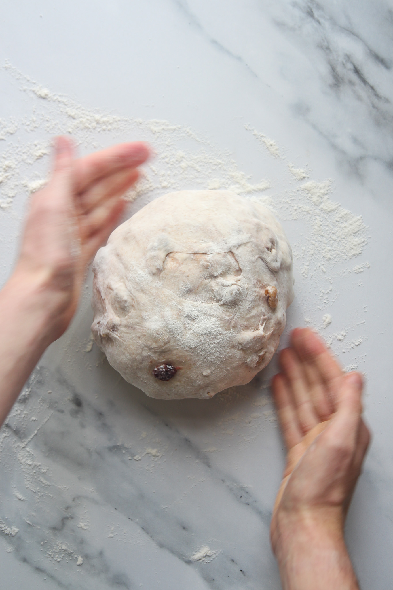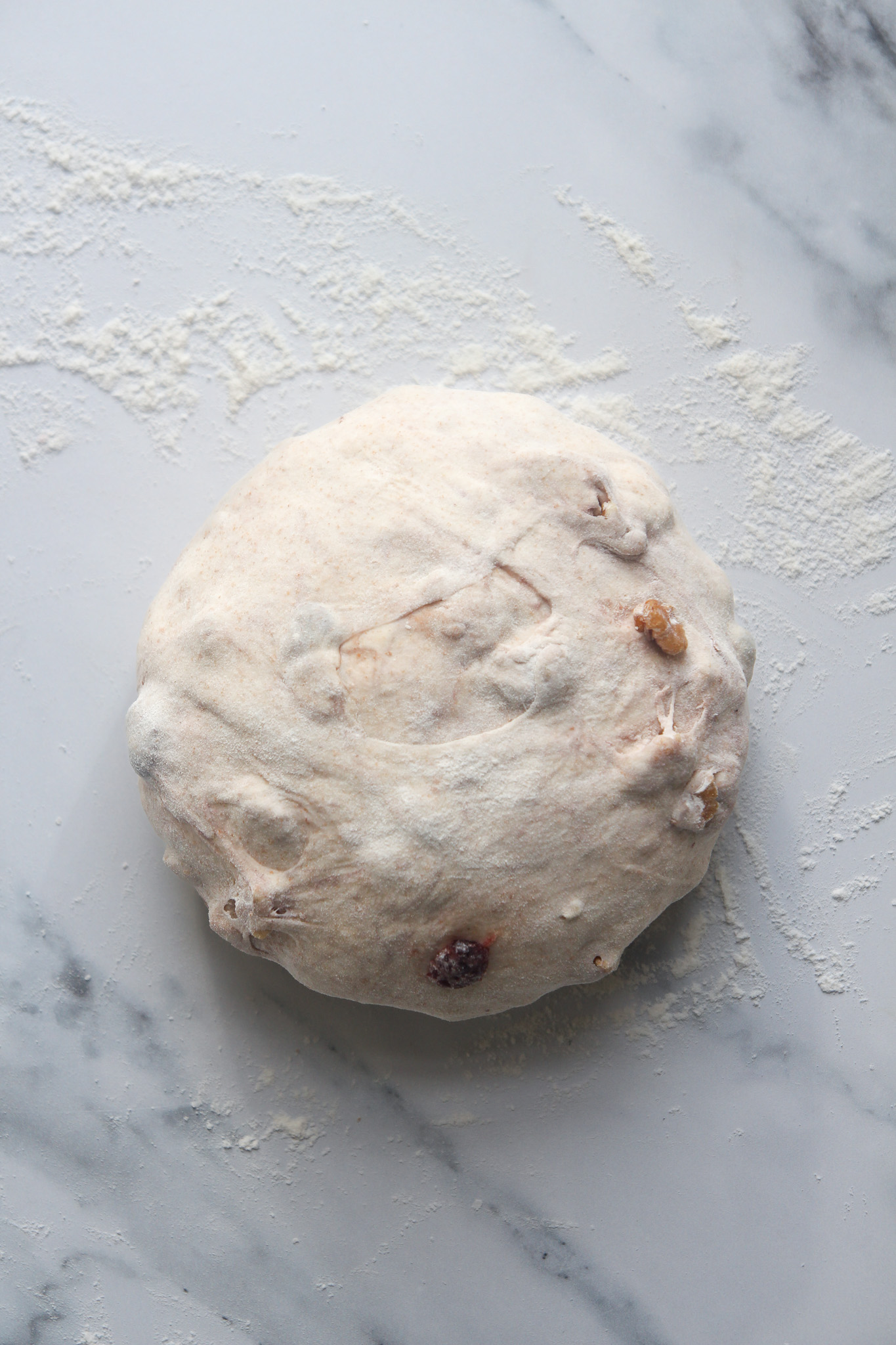 On the second envelope fold—30 minutes into the bulk fermentation—add the cranberries and walnuts. Complete the fold as normal to begin incorporating the cranberries and walnuts. Do not worry if they do not look well incorporated after this initial turn. As you complete the remaining turns over the course of the bulk fermentation, the cranberries and walnuts will become more incorporated.