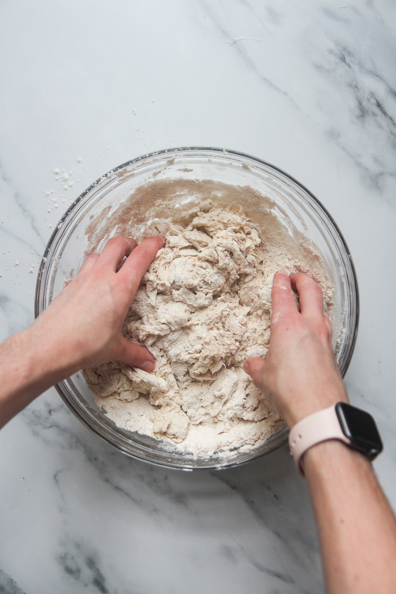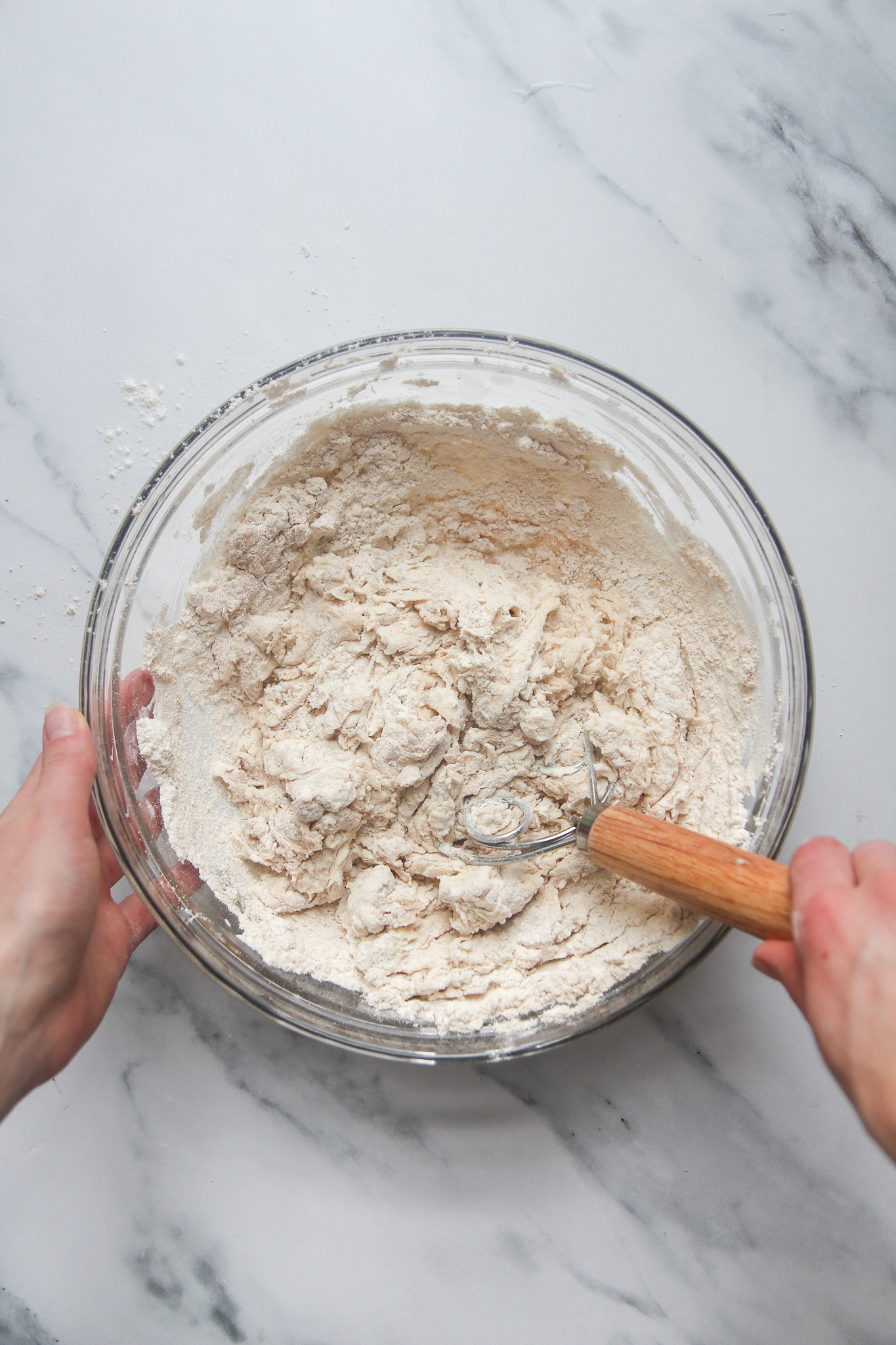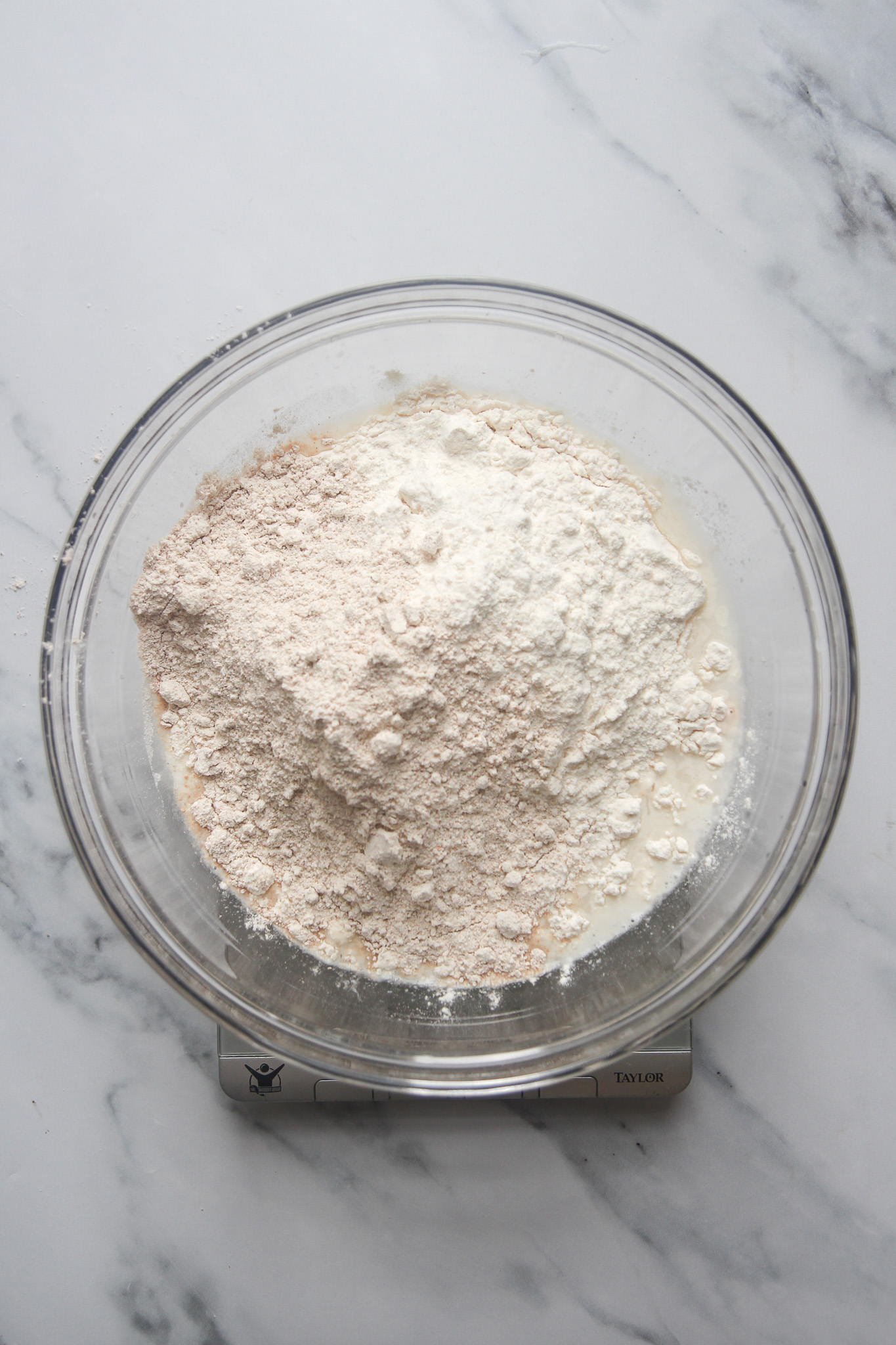 - Measure in the all-purpose and whole spelt flours. Mix everything well until a sticky dough has formed. I use my hands for this process. Cover the bowl with a clean dish towel and let it rest at room temperature for 30 minutes.