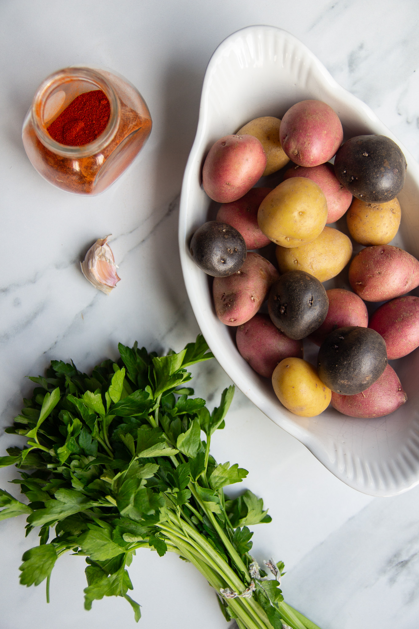 Roasted tricoloured potatoes in a oval white dish with chopped parsley leaves sprinkled over.
