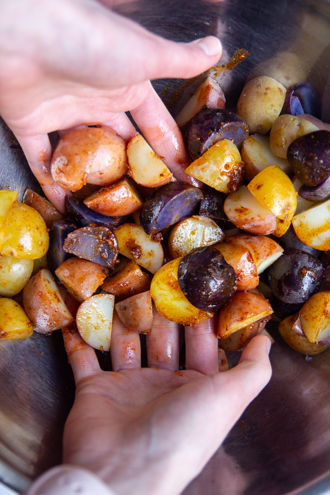 Slice the cooled potatoes into quarters. Transfer the potatoes to the mixing bowl and toss to coat in the seasoning. Place the seasoned potatoes on a lined baking sheet in an even layer.