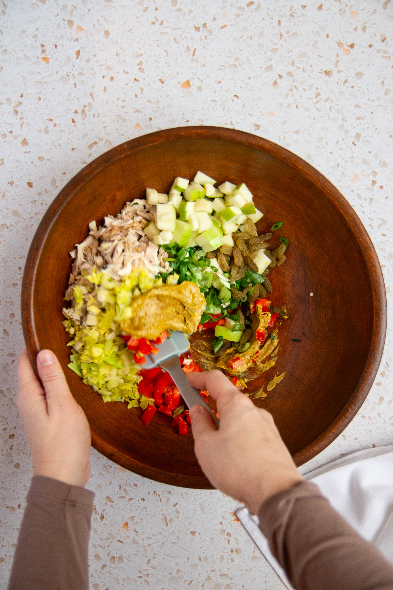 Transfer the curried mayo mixture to the mixing bowl with the salad ingredients.