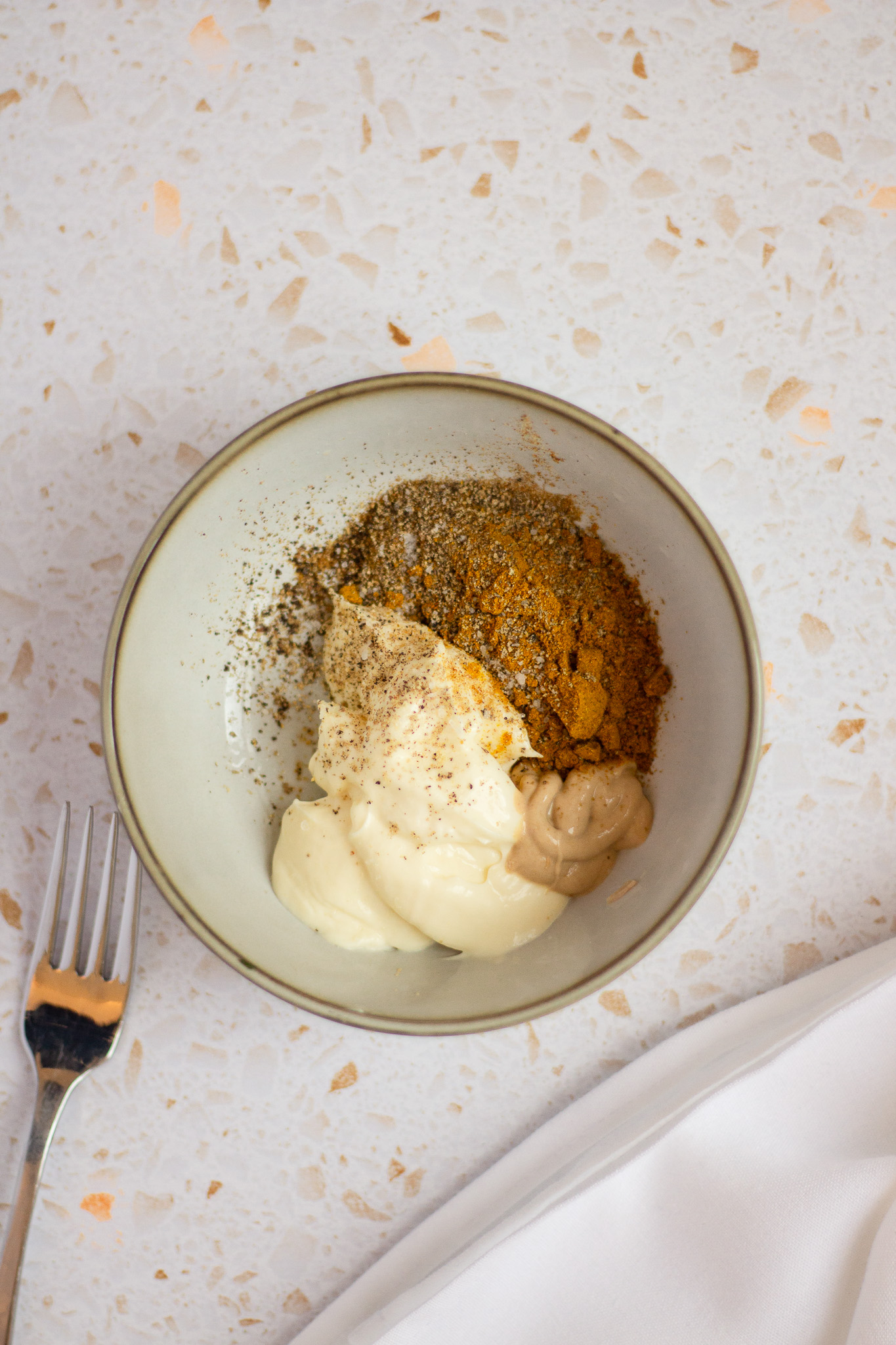 • In a small bowl, whisk together the mayonnaise, Dijon mustard, curry powder, cumin powder, sea salt, and black pepper until combined.