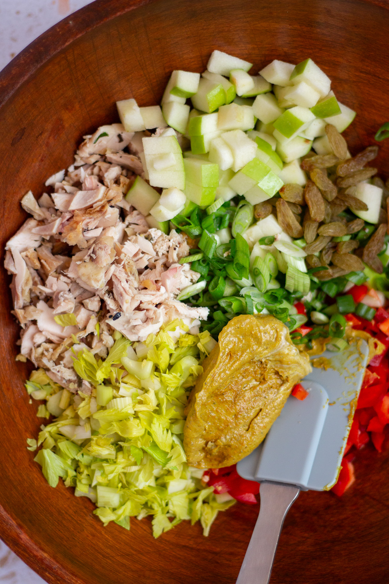 • In a large mixing bowl, toss together the chopped or shredded chicken, celery, green onions, apple, bell pepper, and raisins.