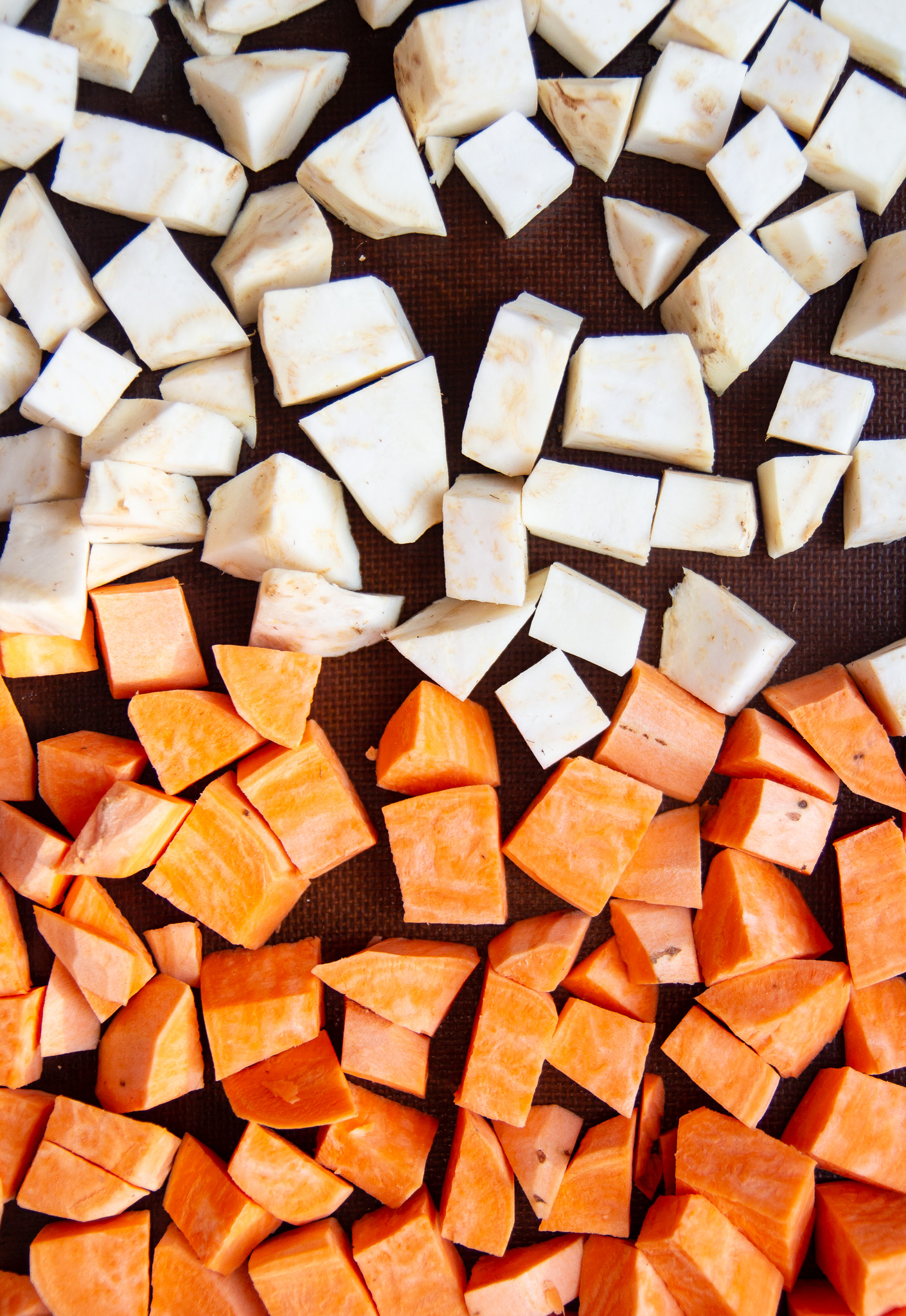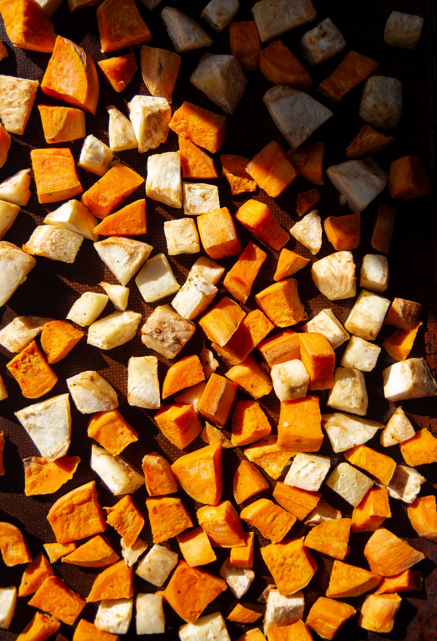 Prep the vegetables by peeling and chopping both the sweet potatoes and celeriac. Drizzle the vegetables in olive oil, then sprinkle with salt and fresh black pepper. Toss to coat.