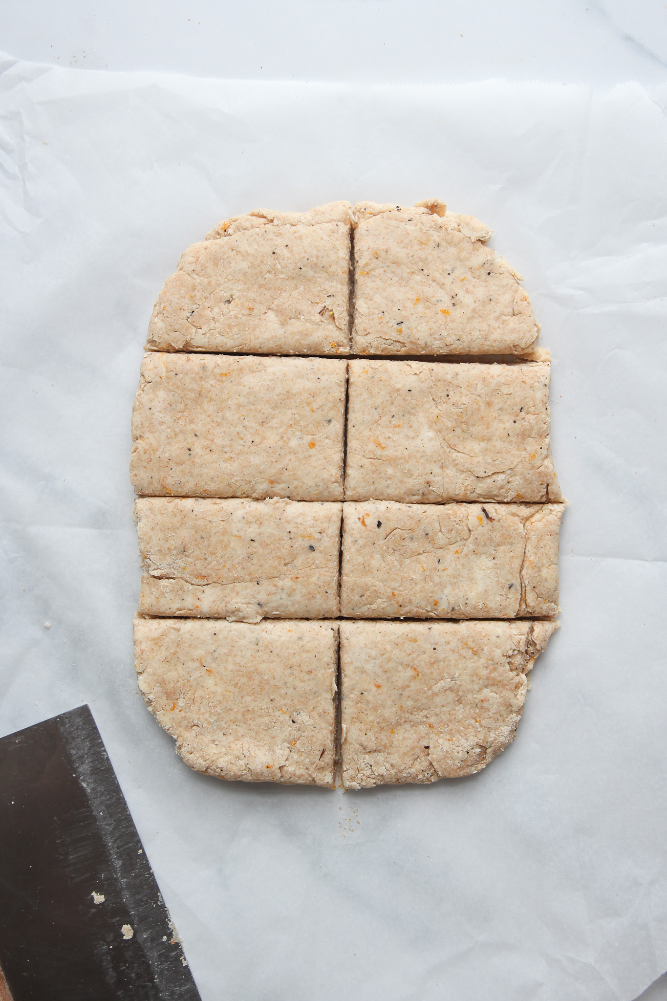 - Transfer the scone dough to a clean, lightly floured work surface. Work the dough into a rough rectangle, then use a rolling pin to roll it out until it measures roughly 10 x 6 inches and 1½ inches thick. Use a bench scraper or knife to cut the dough into 8 roughly even-sized rectangular scones.