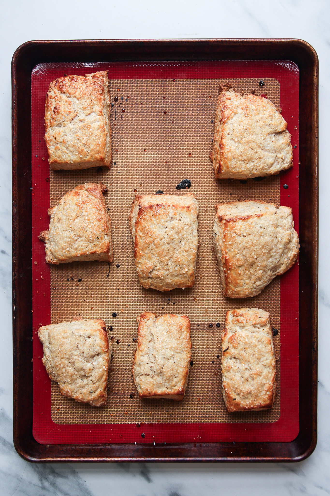 Transfer the scones to a lined baking sheet and brush the tops with the remaining one tablespoon of buttermilk. Sprinkle turbinado sugar over the tops of the scones.