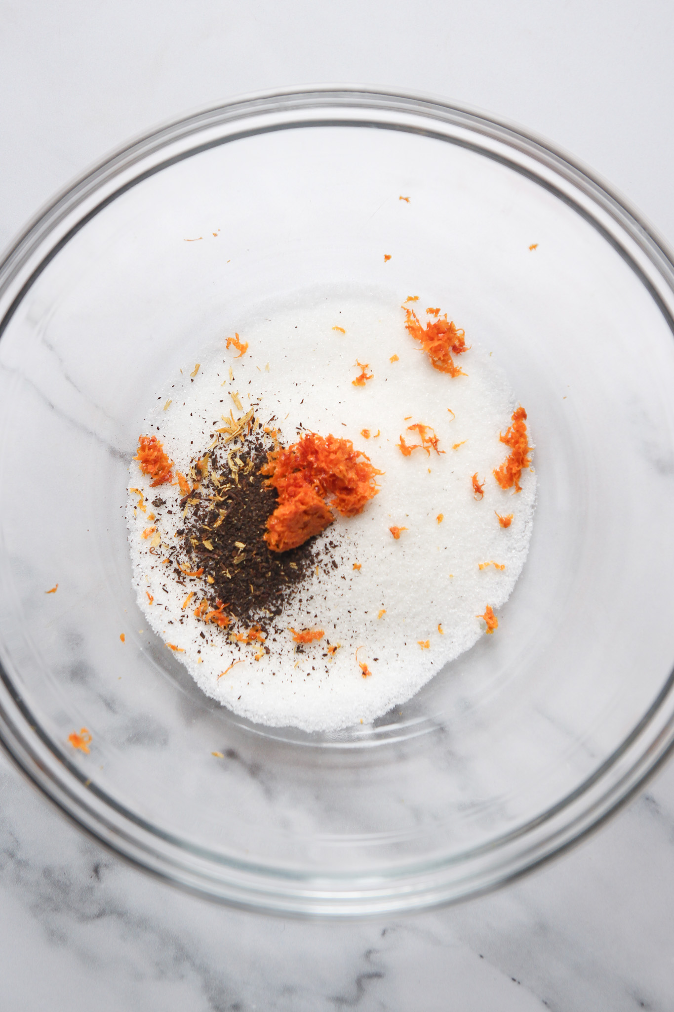 - Measure the white sugar into a large mixing bowl. Add one teaspoon of finely crushed Earl Grey tea leaves and the blood orange zest. Use your fingers to massage the tea and zest into the sugar until fragrant.