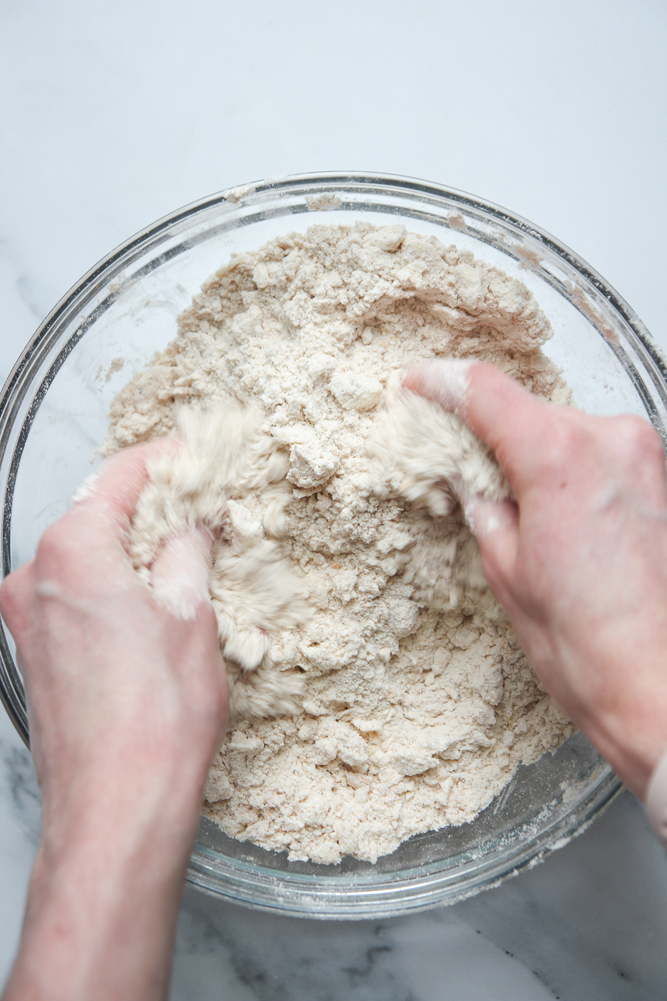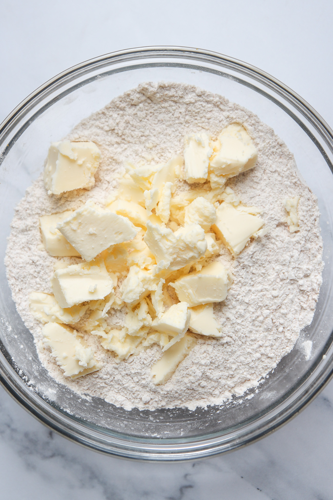 - Add the flours, baking powder, baking soda, and salt to the bowl and whisk well to combine. Use your hands to massage the cold cubed butter into the dry mixture until the dough is a sandy texture.