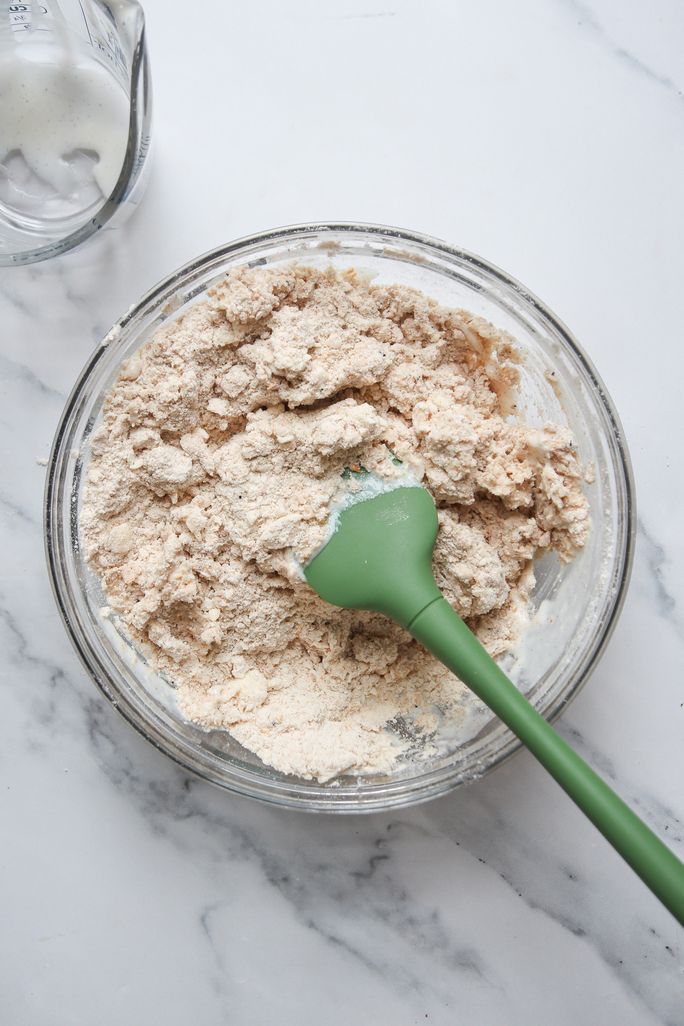 Pour the infused buttermilk into the scone dough. Use your hands to knead the dough together into a ball. The dough will be slightly crumbly and require a bit of pressure to stay together.