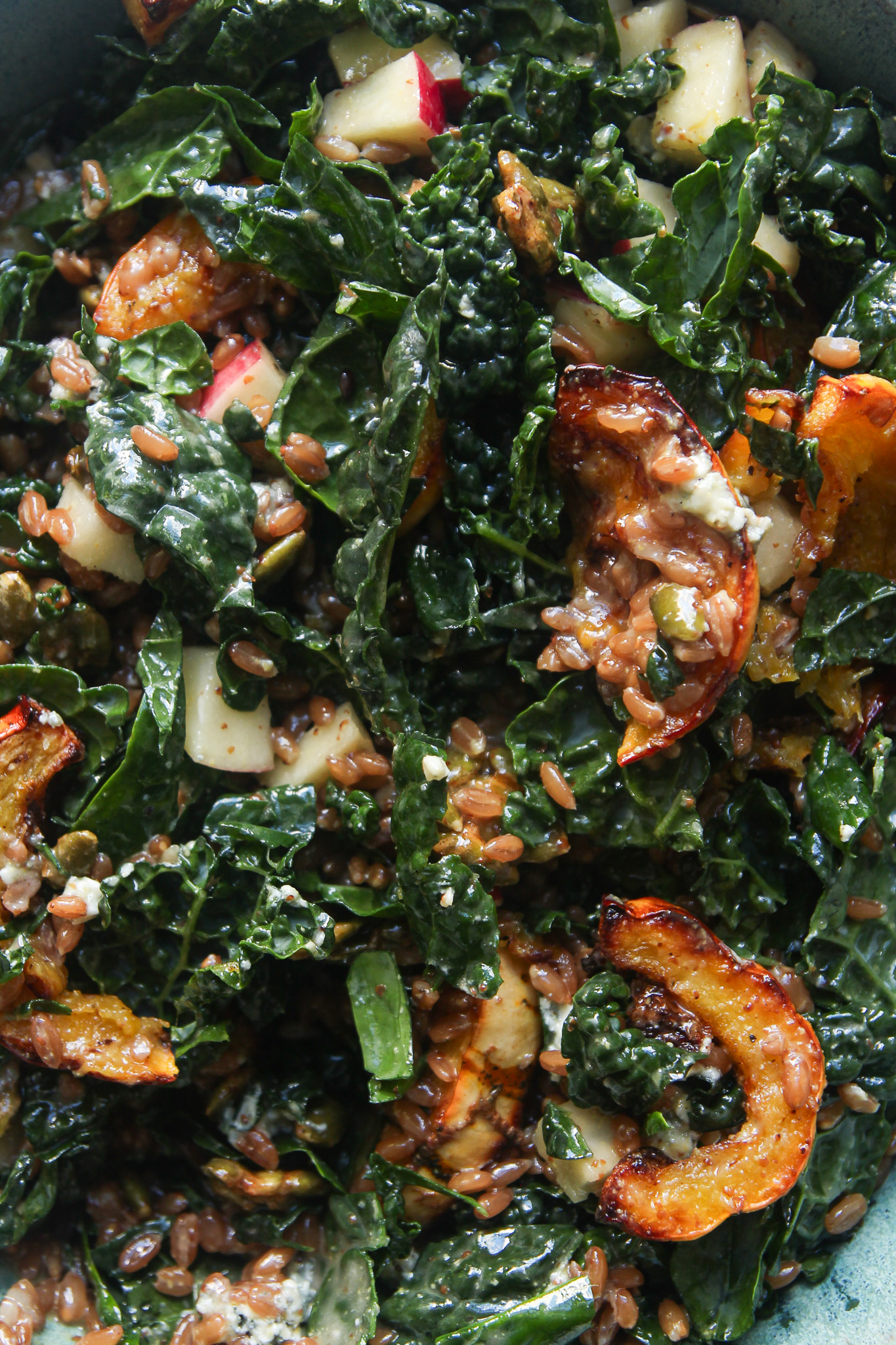 - Assemble the salad. To a large serving bowl, add the cooled spelt berries, kale, apple, and roasted delicata squash. Pour over the maple Dijon vinaigrette, then toss well to coat. Crumble over the Roquefort blue cheese and the pumpkin seed brittle. Toss the salad again to incorporate. Serve immediately, or store in the fridge for up to 5 days.