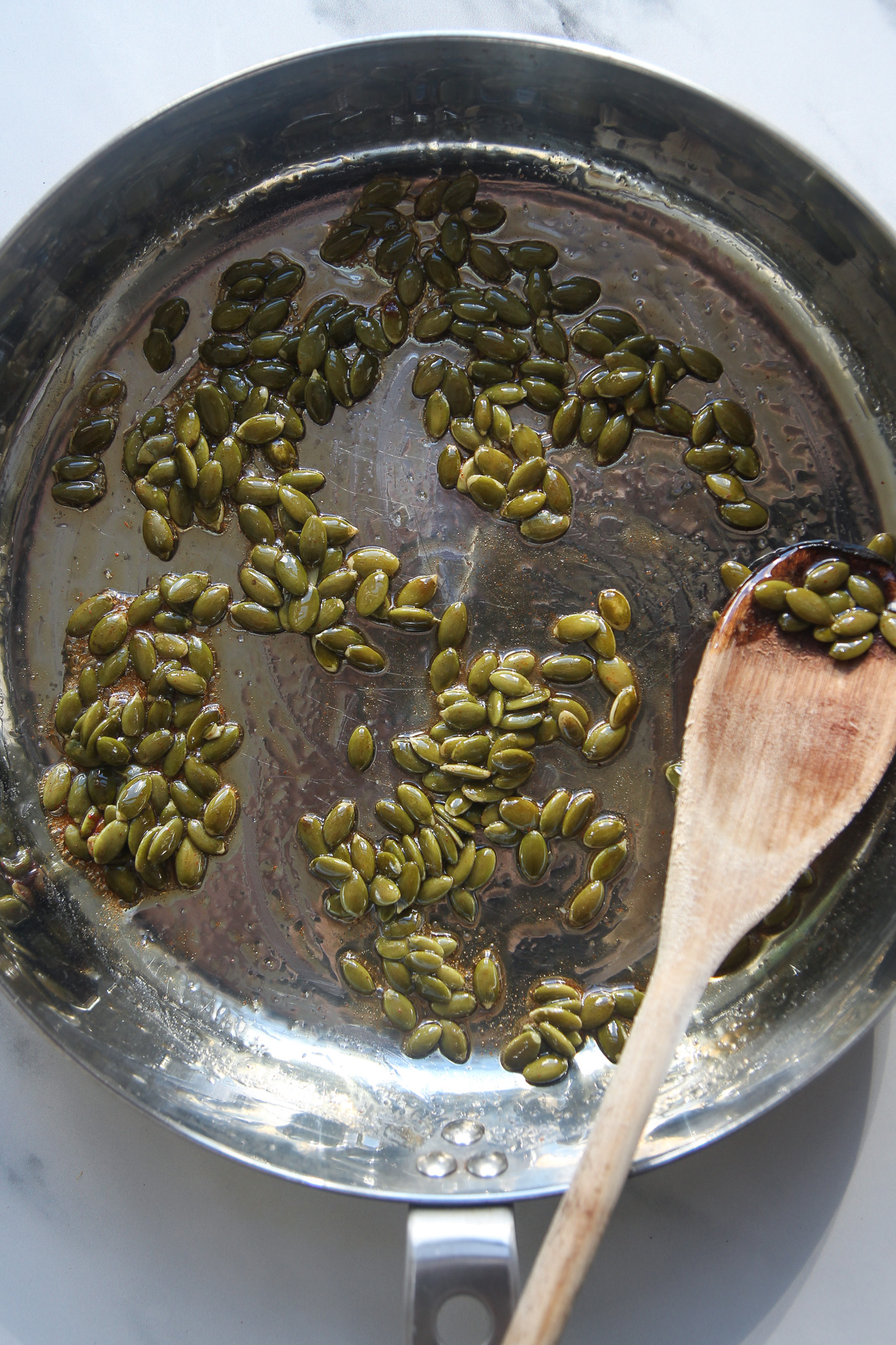 Heat a stainless steel pan over medium-low heat. Once heated, pour in the maple syrup. It will start to bubble and steam instantly. Add the pumpkin seeds, cayenne pepper, and sea salt. Cook, stirring constantly, until the maple syrup has reduced and coated the seeds.
