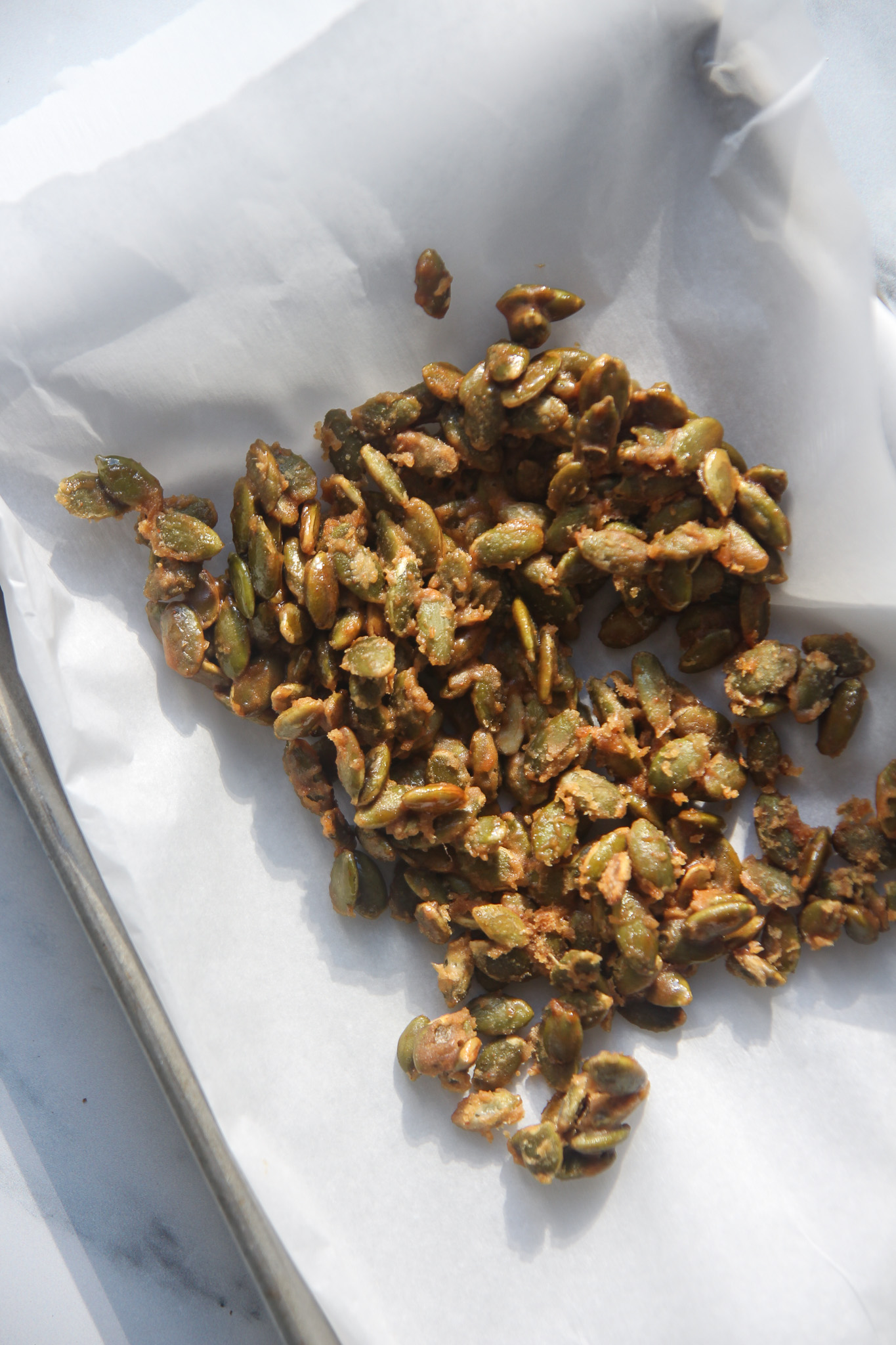 - Prepare the pumpkin seed brittle. Heat a stainless steel pan over medium-low heat. Once heated, pour in the maple syrup. It will start to bubble and steam instantly. Add the pumpkin seeds, cayenne pepper, and sea salt. Cook, stirring constantly, until the maple syrup has reduced and coated the seeds. Remove the pan from the heat and transfer the brittle to a sheet of parchment to cool.