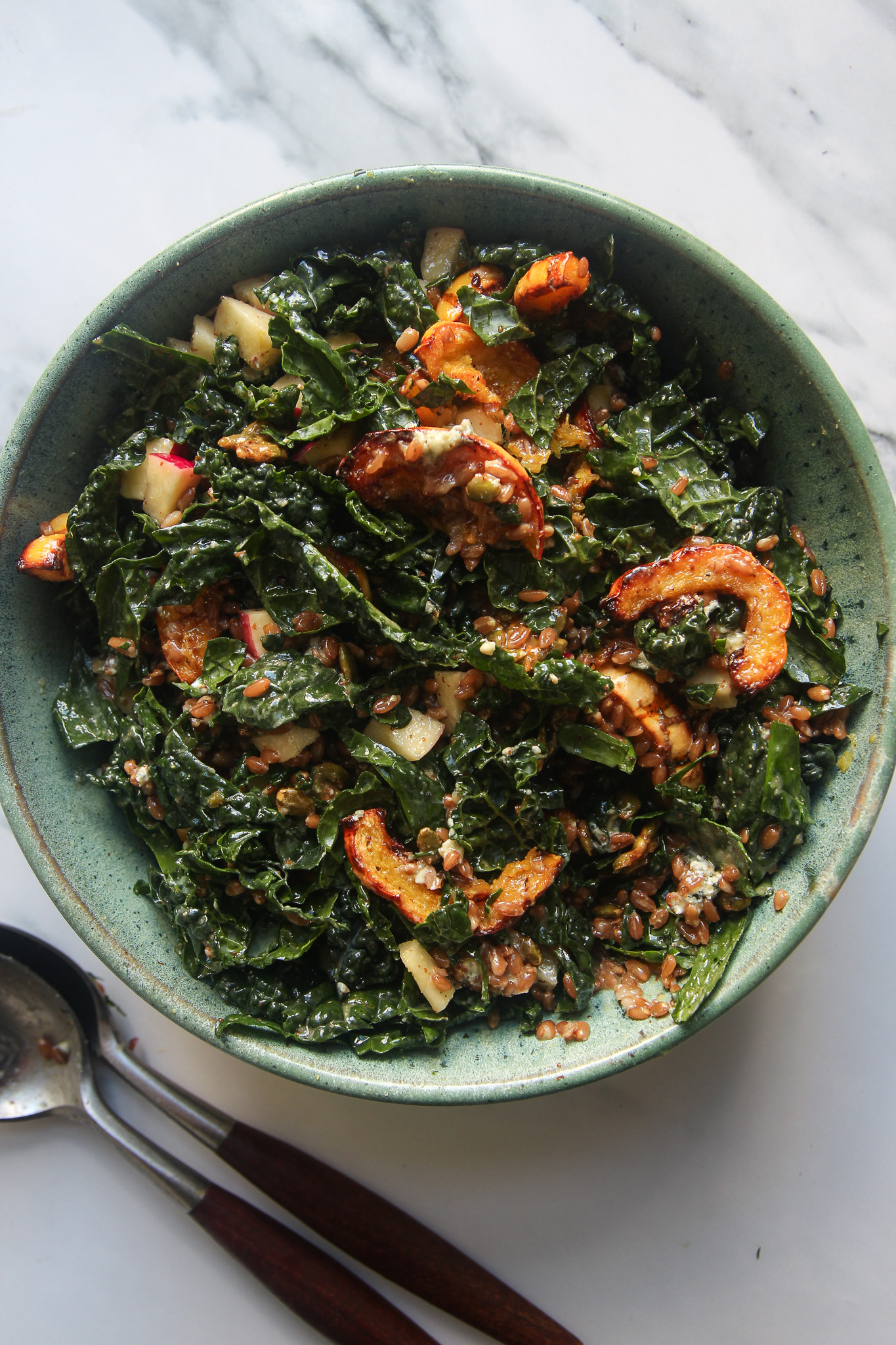 To a large serving bowl, add the cooled spelt berries, kale, apple, and roasted delicata squash. Pour over the maple Dijon vinaigrette, then toss well to coat. I like to get in there with my hands to massage the dressing into the kale so it softens a bit.
