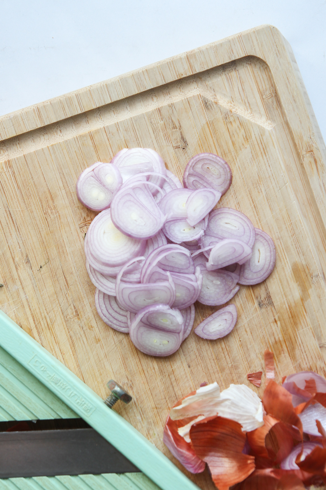 - While the oil is heating, thinly slice the shallots. To get even slices, I like to use a mandoline to slice the shallots. A sharp chef's knife will work too.