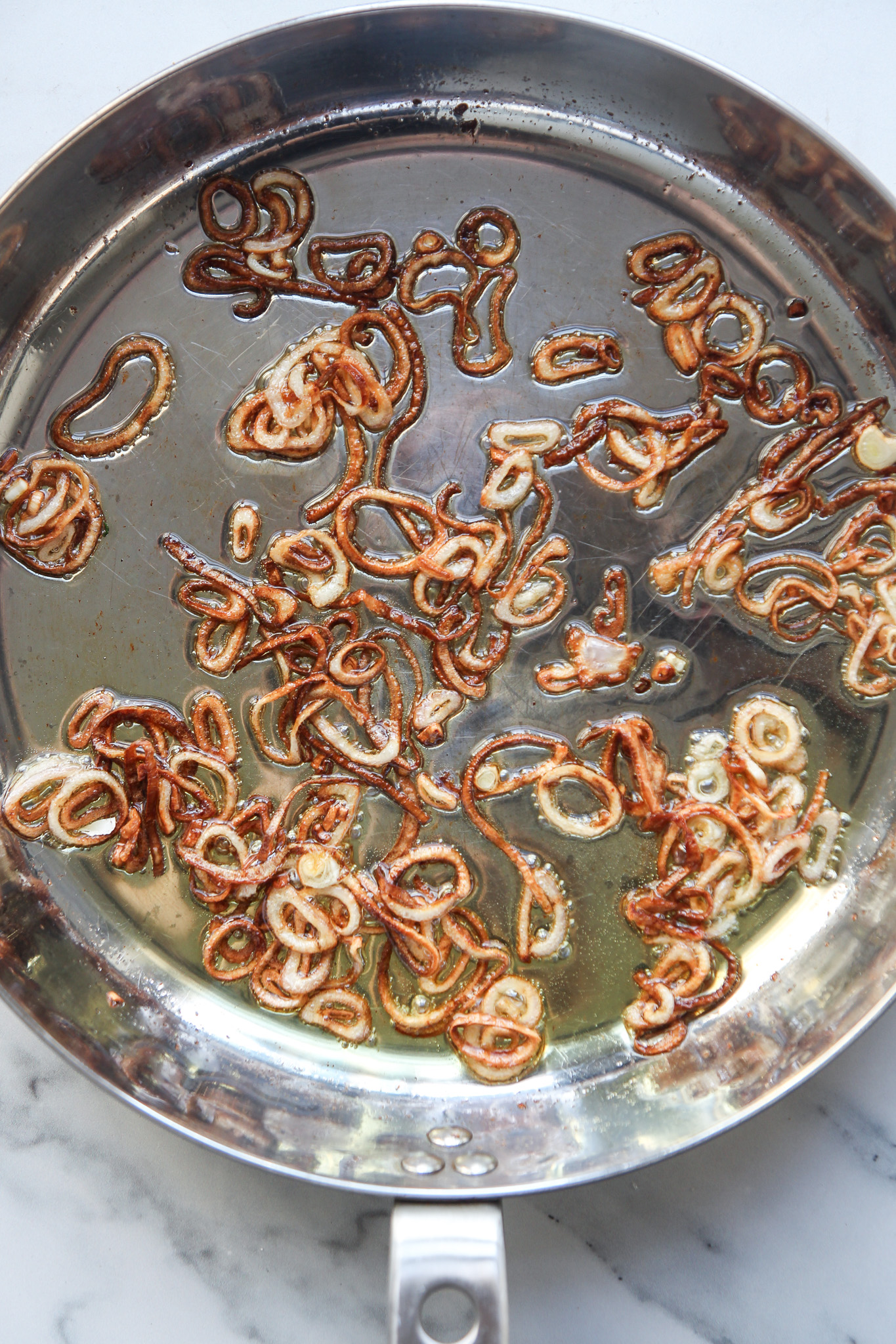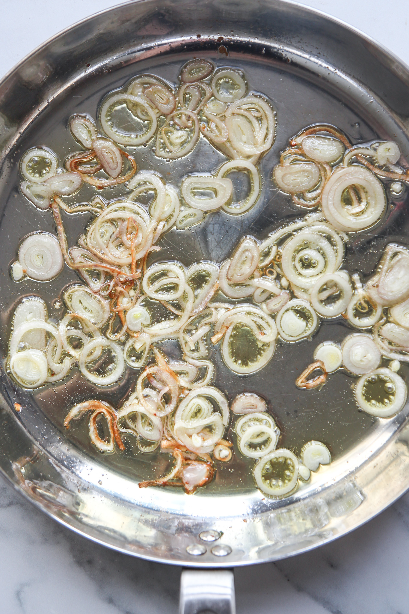 - Add the sliced shallots to the hot oil and fry, stirring frequently, until golden brown. It will take about 3-4 minutes for the shallots to turn golden. Transfer the fried shallots to the paper towel-lined plate and season with salt.