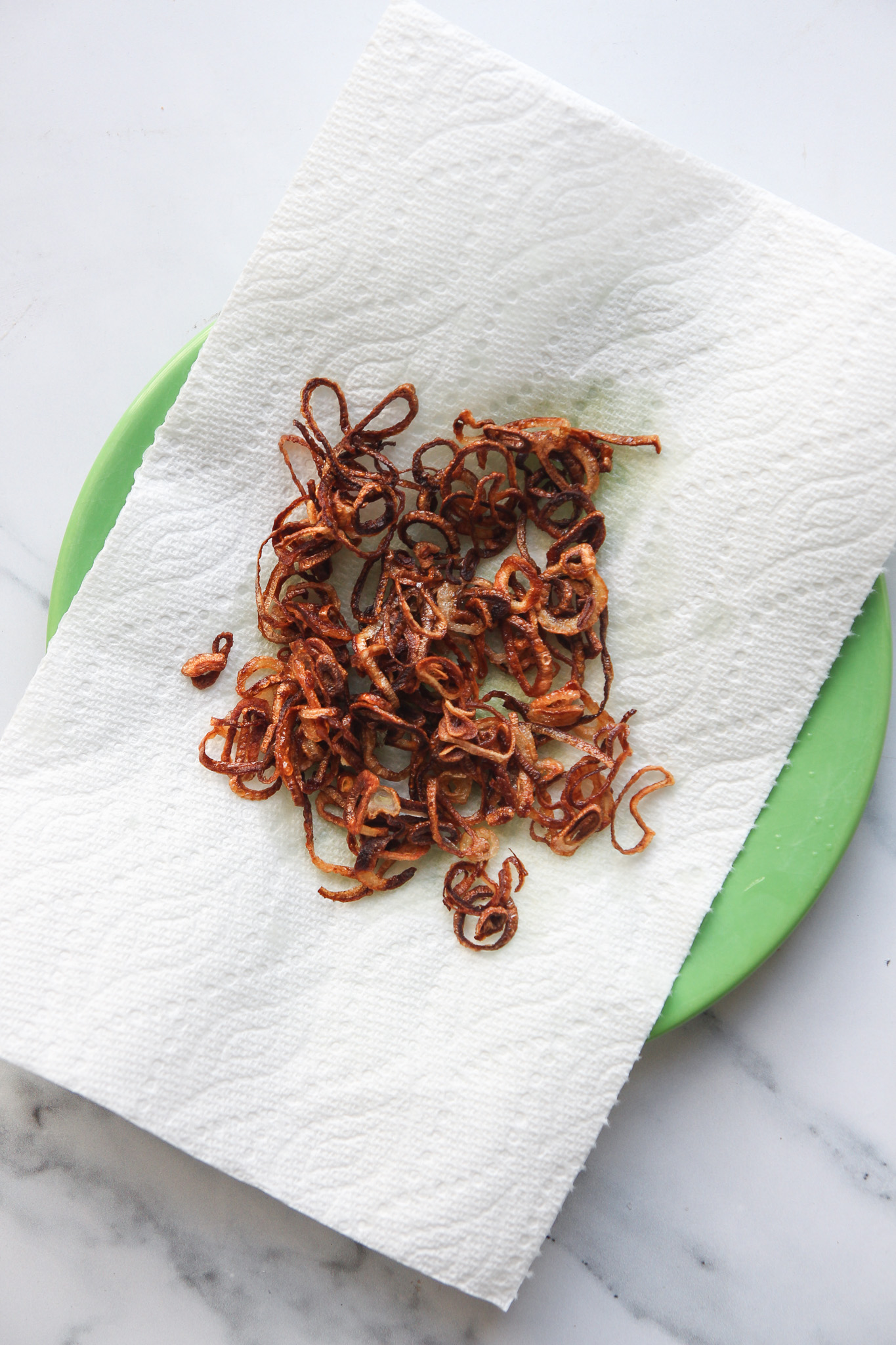 Add the sliced shallots to the hot oil and fry, stirring frequently, until golden brown. It will take about 3-4 minutes for the shallots to turn golden. Transfer the fried shallots to the paper towel-lined plate and season with salt.