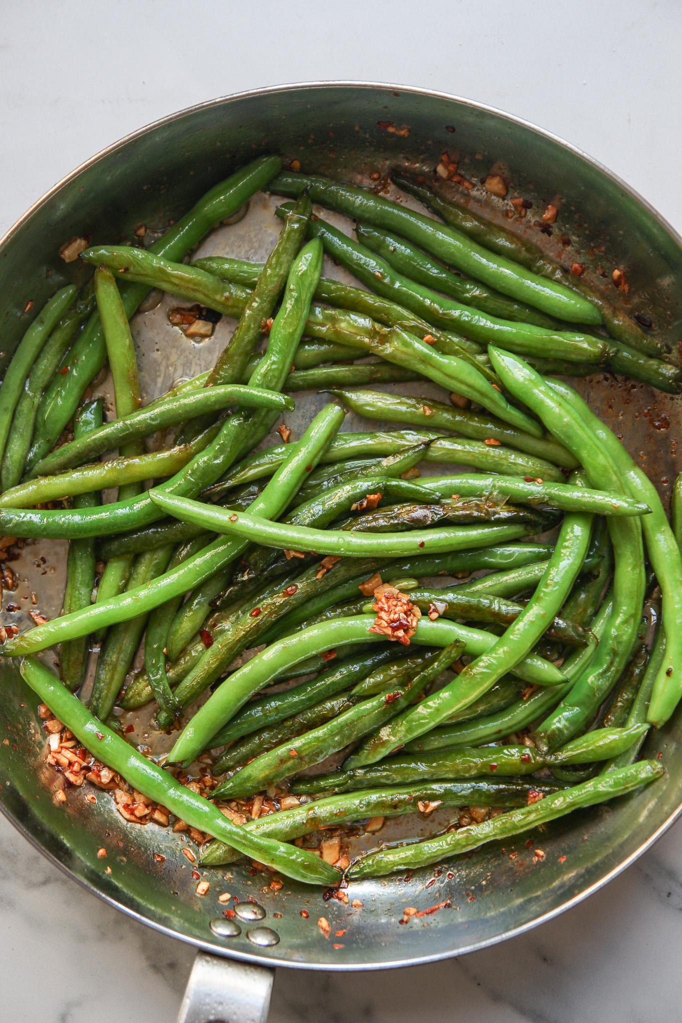- Add the green beans directly into the pan you used to fry the shallots. Toss the beans to coat with oil, then fry the beans for 2 minutes undisturbed. Flip the beans and fry for a further 2 minutes undisturbed. Add the minced garlic, chili flakes, and salt. Fry for a further minute, then pour in the maple syrup. Toss the beans to coat and fry for a final 2 minutes, stirring frequently.