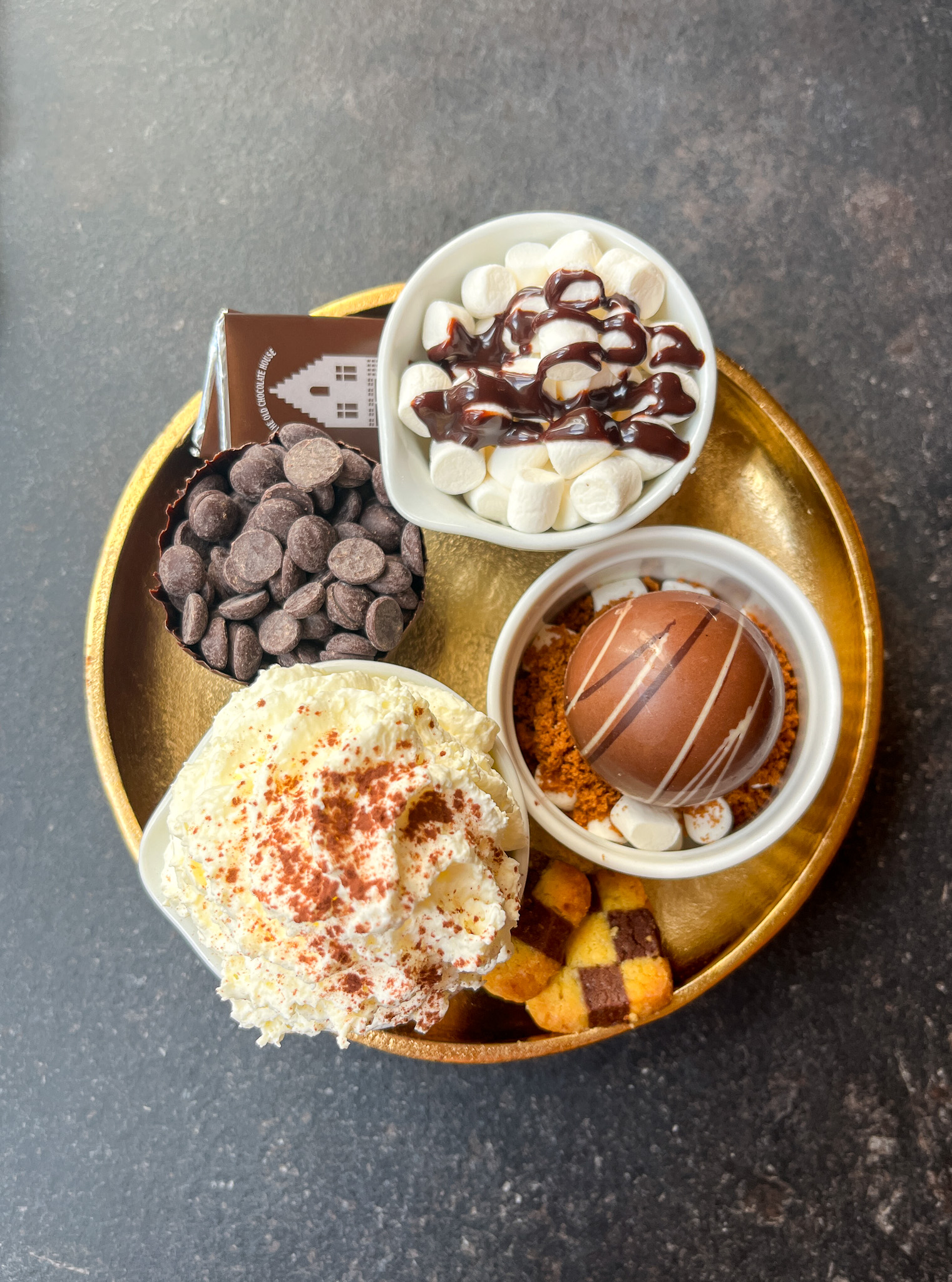 The tearoom has an extensive menu of hot chocolates ranging from classic to extravagent. From the menu, you select what kind of milk you’d like, what kind of chocolate, and your toppings. What arrives on your table is a deconstructed hot chocolate of sorts. A mug full of hot milk is placed in front of you, while a tray with your chocolate and toppings will is in the middle of the table. This is the fun part: now you get to drop your chocolate into the warm milk like a chocolate bomb and watch it turn into the most rich and decadent hot chocolate you’ve ever seen while mixing away with a tiny little whisk.