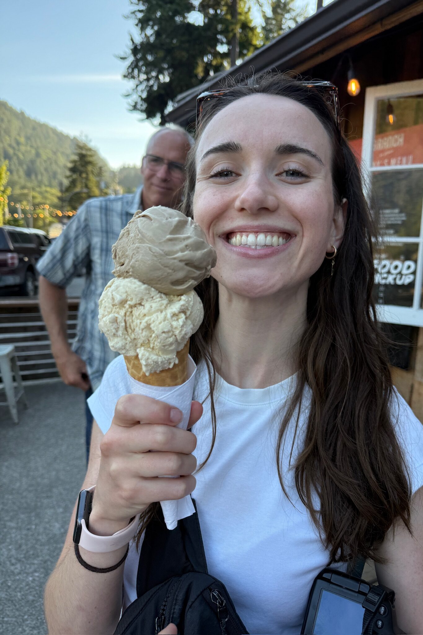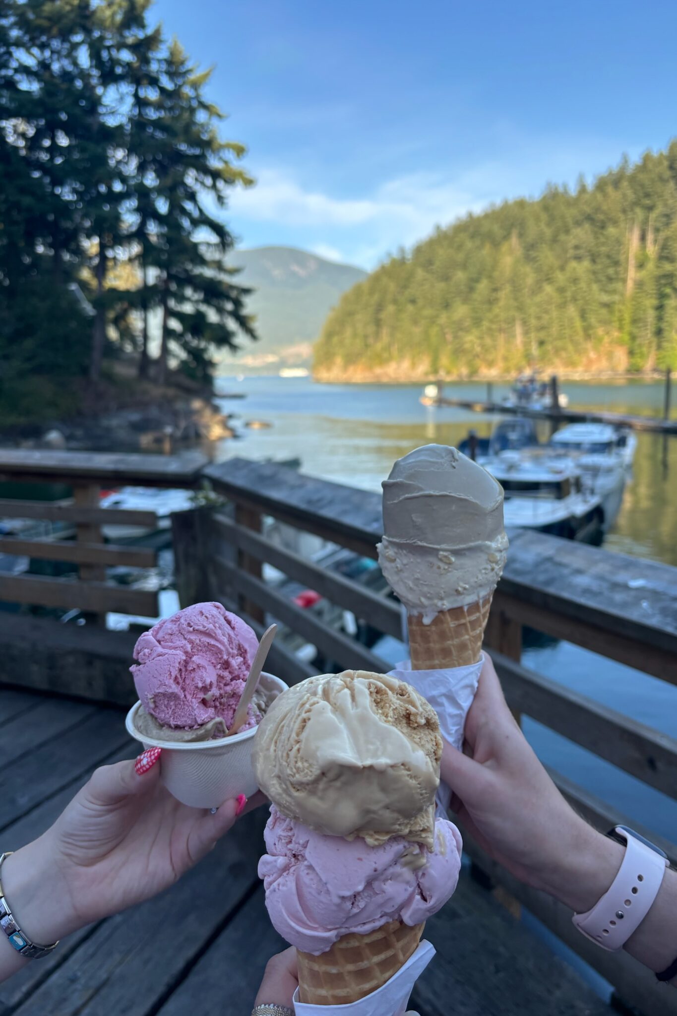 After cooling off in the ocean, we walked back to the Snug Cove Pier to order ice cream from Branch on Bowen. Branch scoops Earnest Ice Cream, a Vancouver-based ice cream company that makes delicious, fresh, and unique flavours. I got a giant cone of London Fog and Oatmeal Brown Sugar. The London Fog flavour tasted just like the drink. It was honestly kind of wild! Shoutout to this man in the background of the picture above—he turned around and realized we were taking a photo and fully smiled and posed. It was hilarious.