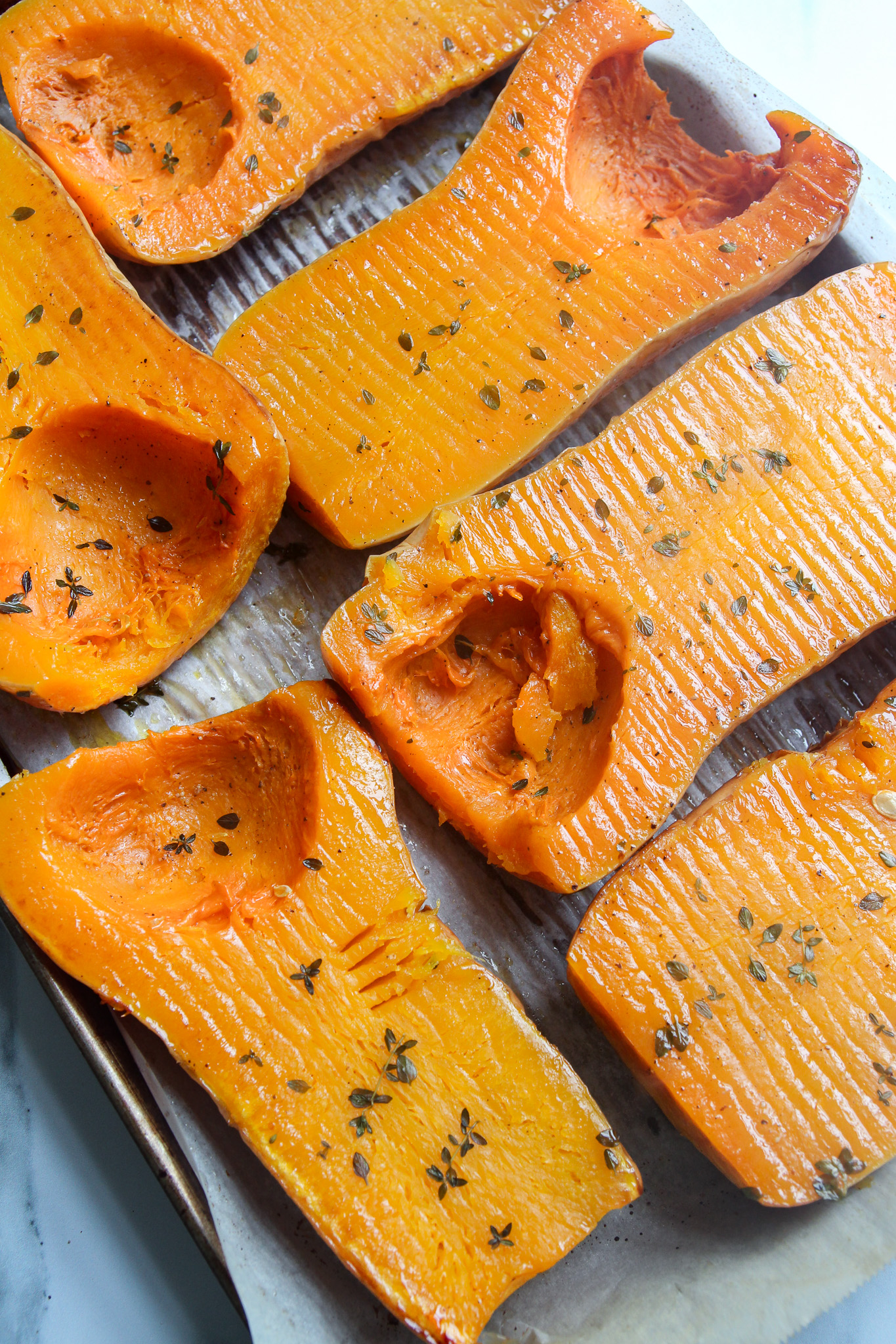 • Slice the squashes in half lengthwise and scoop out the seeds. Rinse and roughly chop the thyme. Place the squash on a large rimmed baking sheet and drizzle with olive oil, then sprinkle with salt, pepper, and thyme. Flip the squashes so they are cut-side-down on the baking sheet and roast for 1 hour and 15 minutes or until the squash is soft enough to stick a fork through. Remove from oven and set aside to cool.
