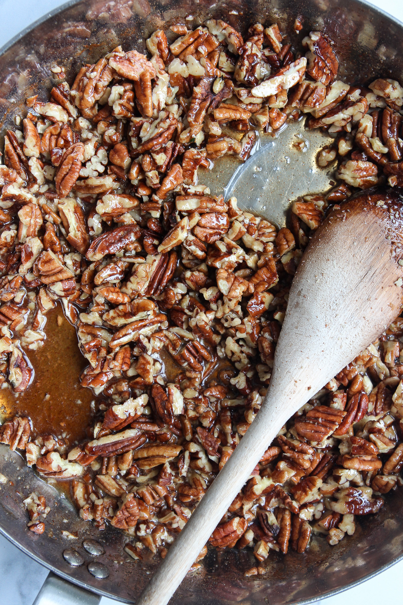 Once the maple syrup has reduced, pour in the roughly chopped pecans and stir well to coat. Continue to cook the pecans, stirring frequently, for another 5 to 6 minutes. The pecans are ready when basically no maple syrup remains on the bottom of the pan.
