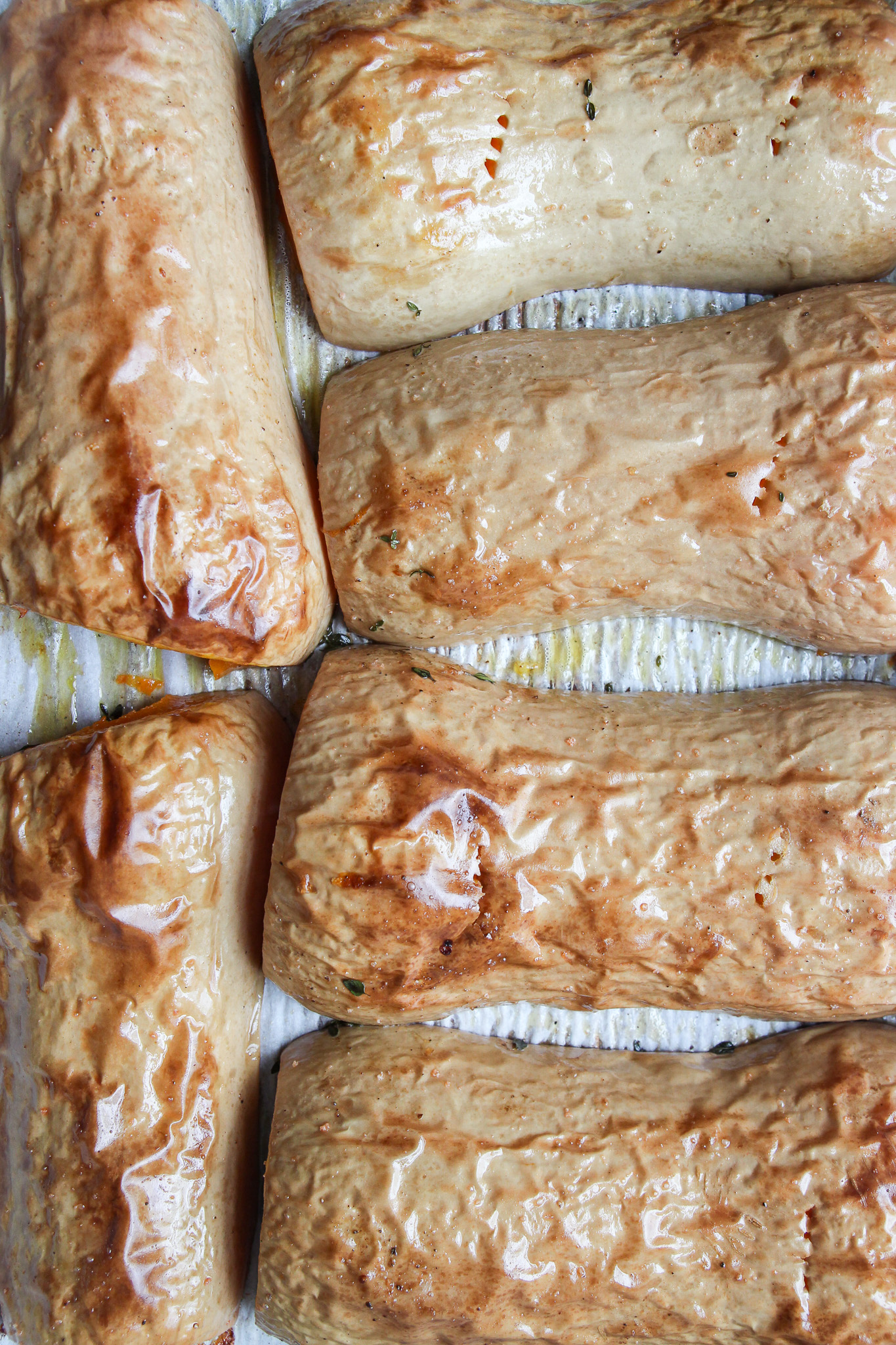 Halved butternut squashes.