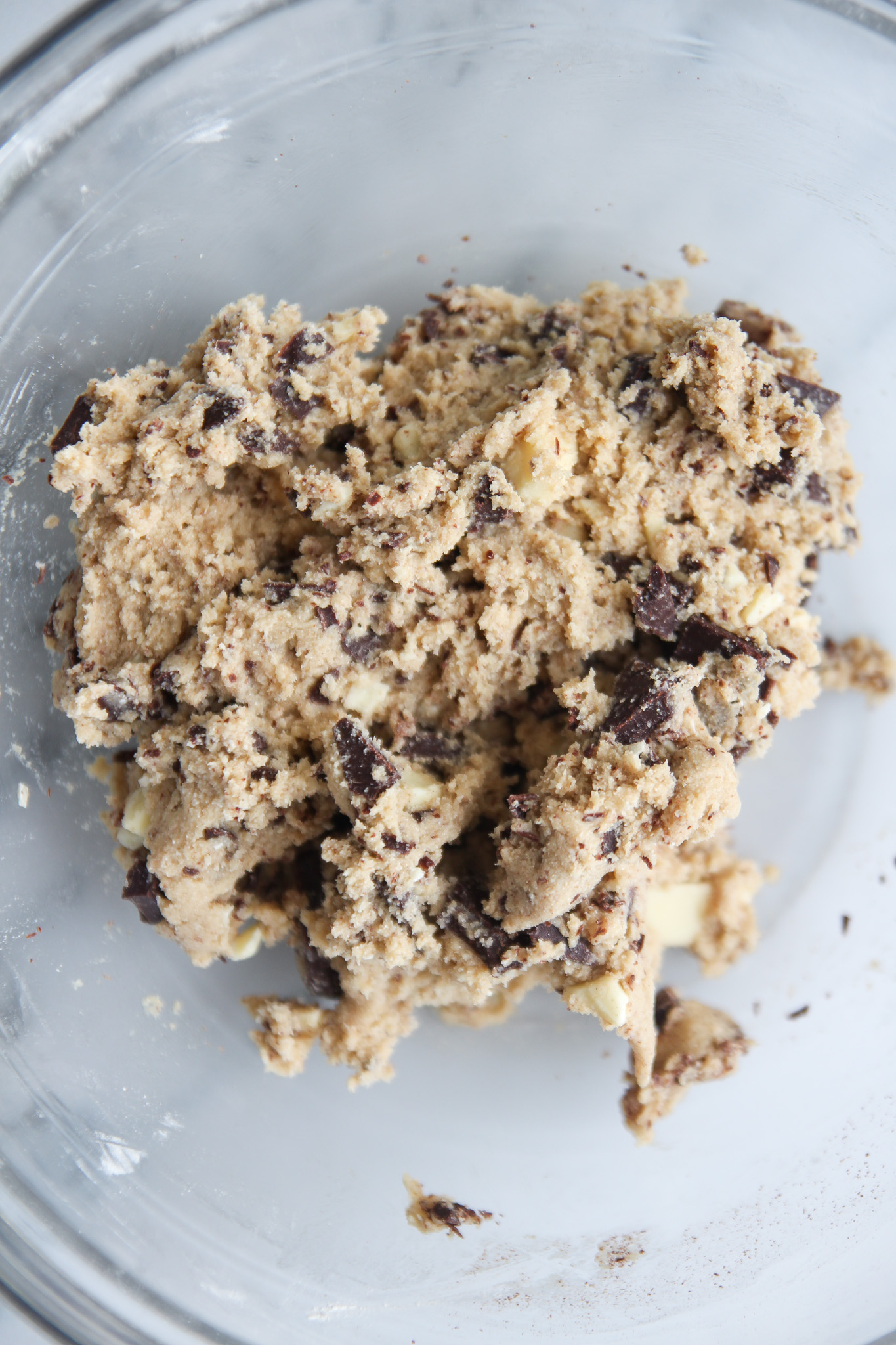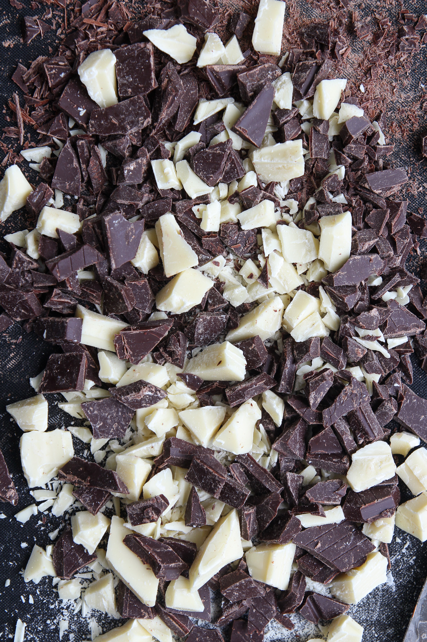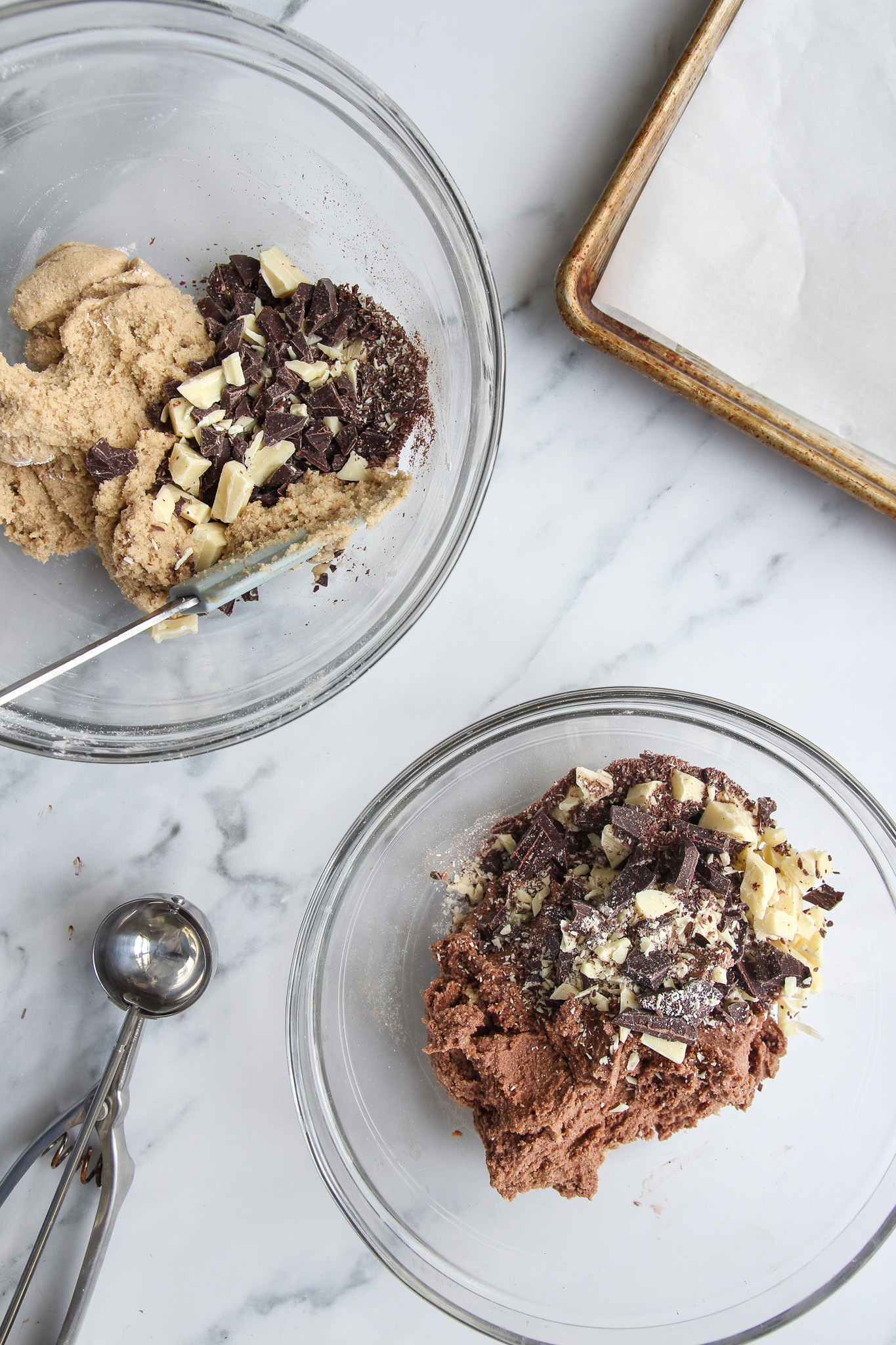 Roughly chop the white and dark chocolate into chunks. Split the chocolate chunks between the base dough and chocolate dough, folding it into each with a baking spatula.