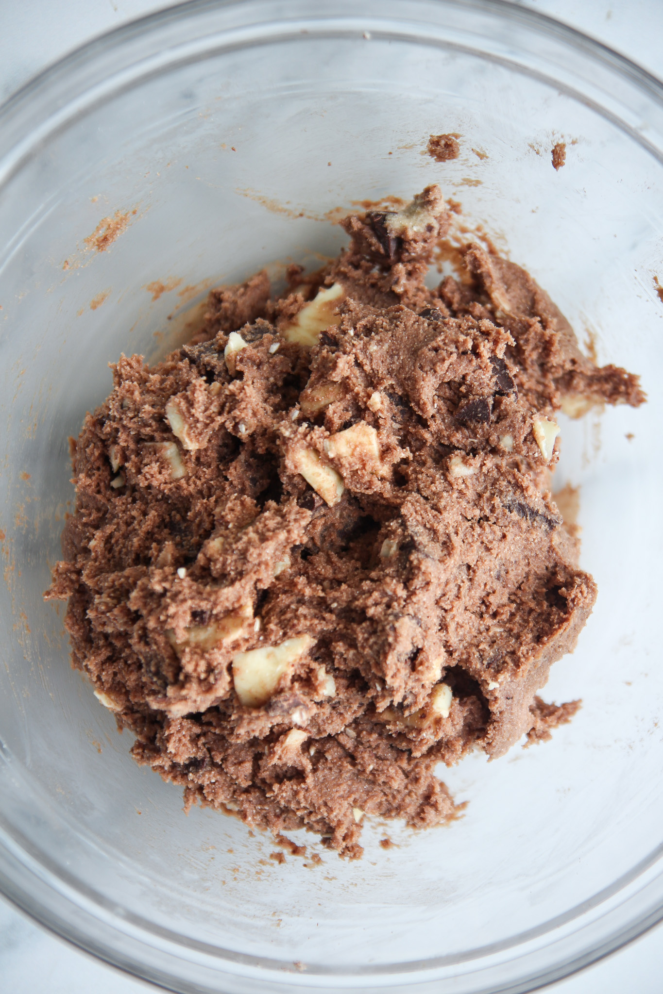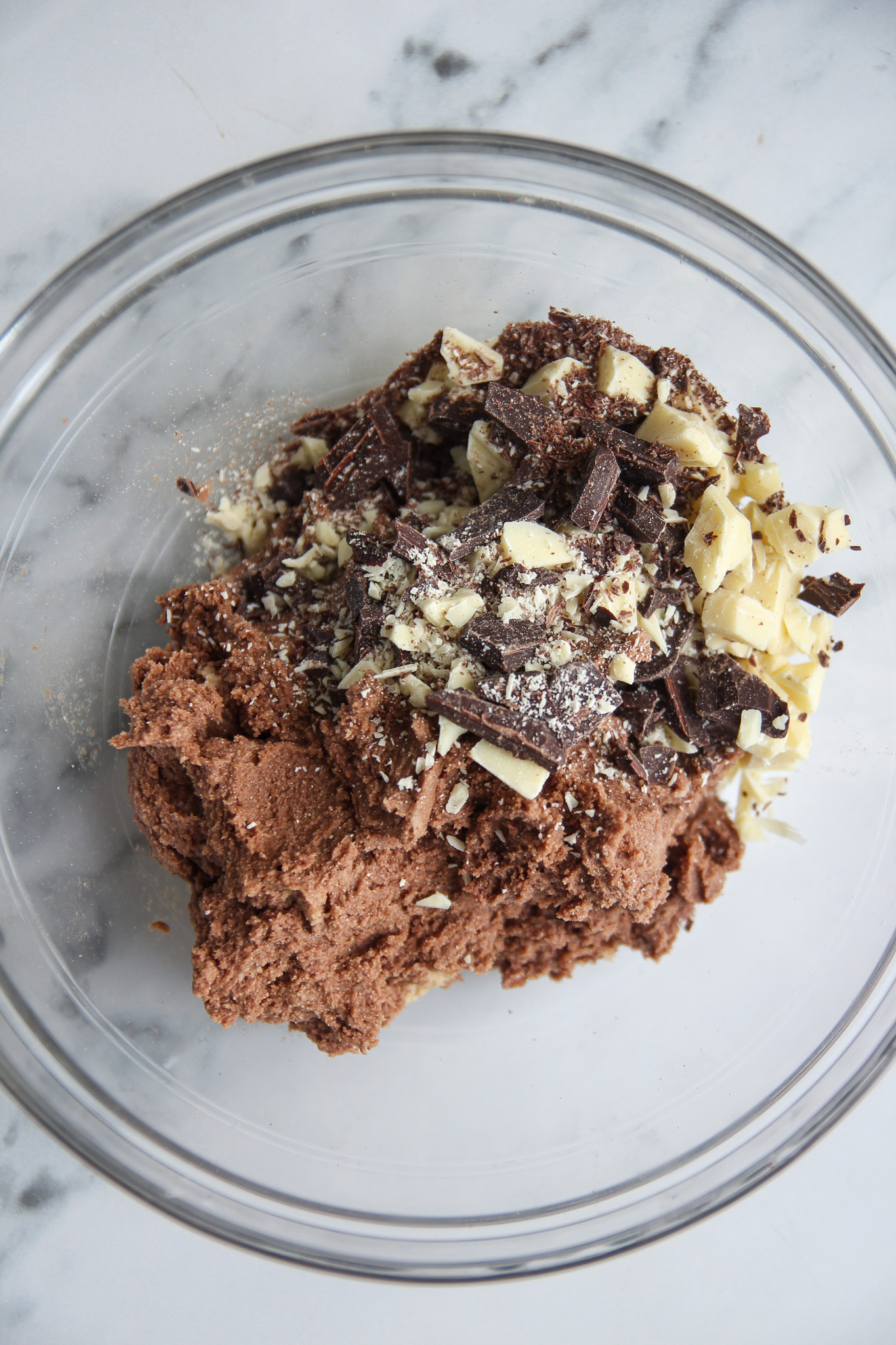 - Roughly chop the white and dark chocolate, then divide it between the regular and chocolate doughs. Using a baking spatula, fold in the chocolate until evenly distributed.