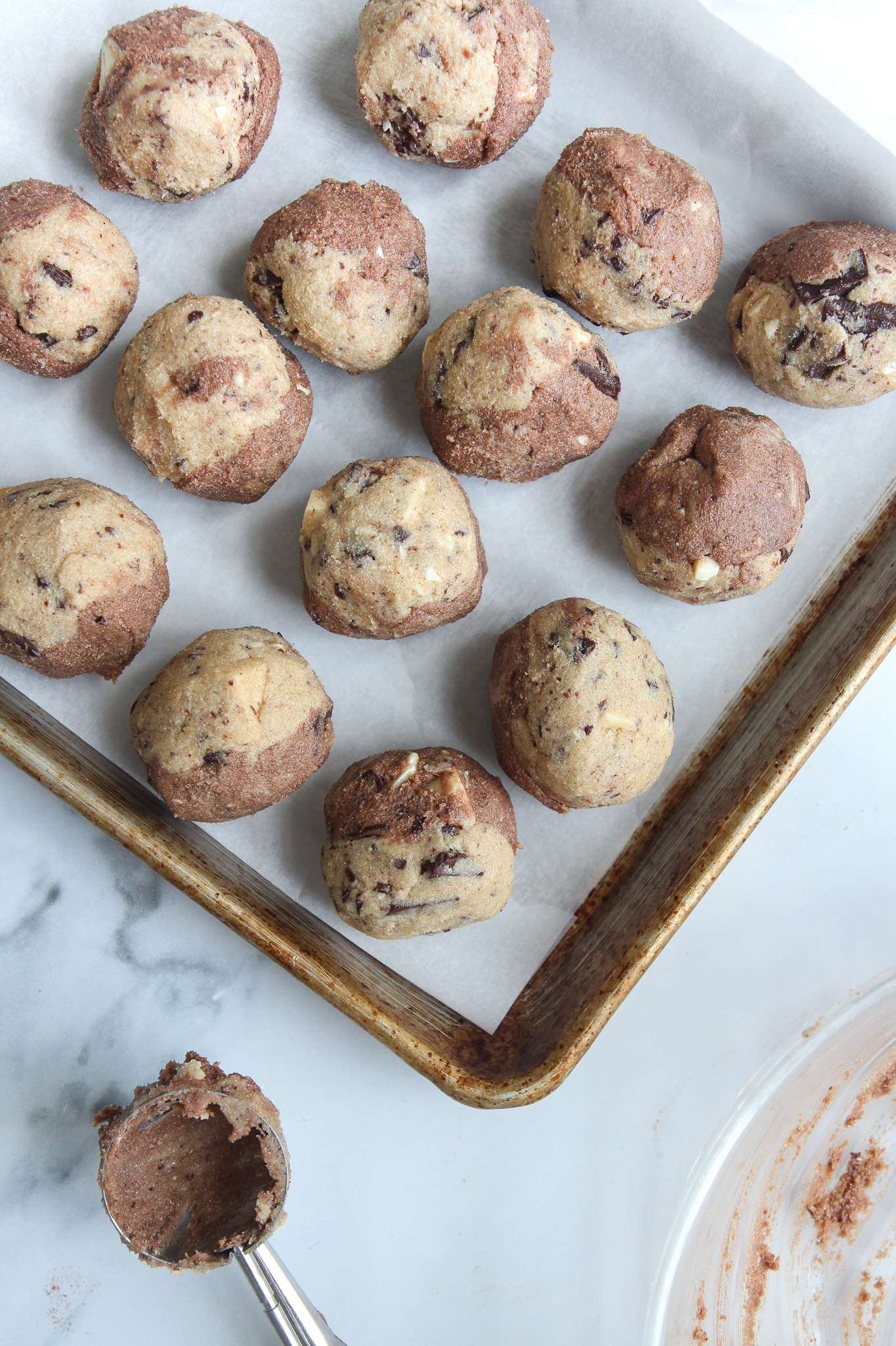 - Use a small cookie scoop to scoop a ball of the regular and chocolate doughs. Gently squish the two balls of dough together and roll into a smooth ball between your palms. Transfer to a lined baking sheet. Repeat with the rest of the dough. The dough will yield 16-18 cookies.