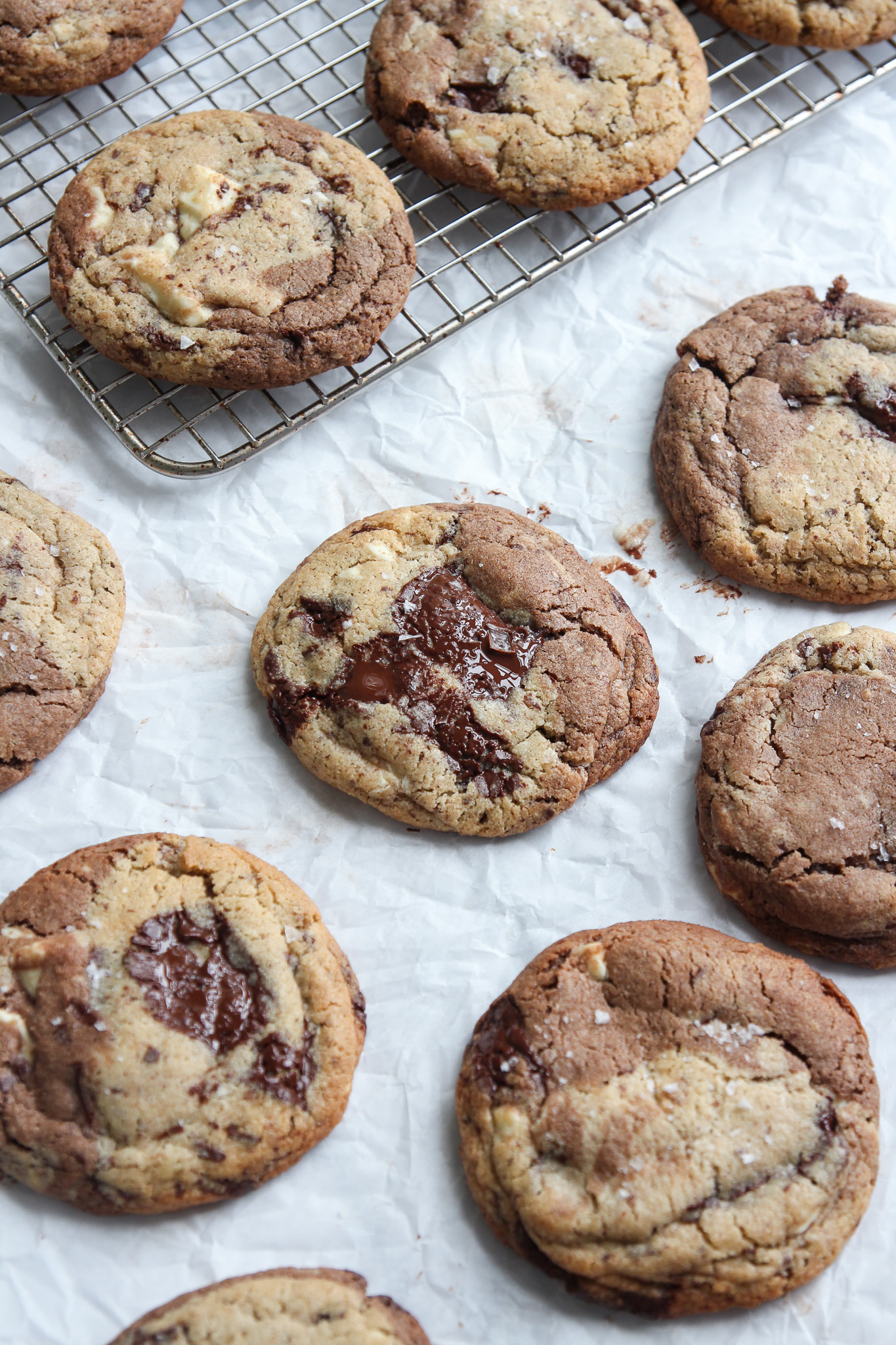 Bake for 8 to 10 minutes. The cookies will look a little raw in the middle still, but trust me, they are ready to come out; the middles will set and firm up a bit as the cookies cool. Sprinkle the tops of the cookies with a bit of flaky salt because chocolate + salt = heaven.