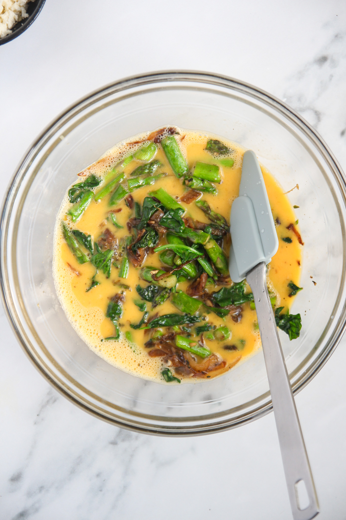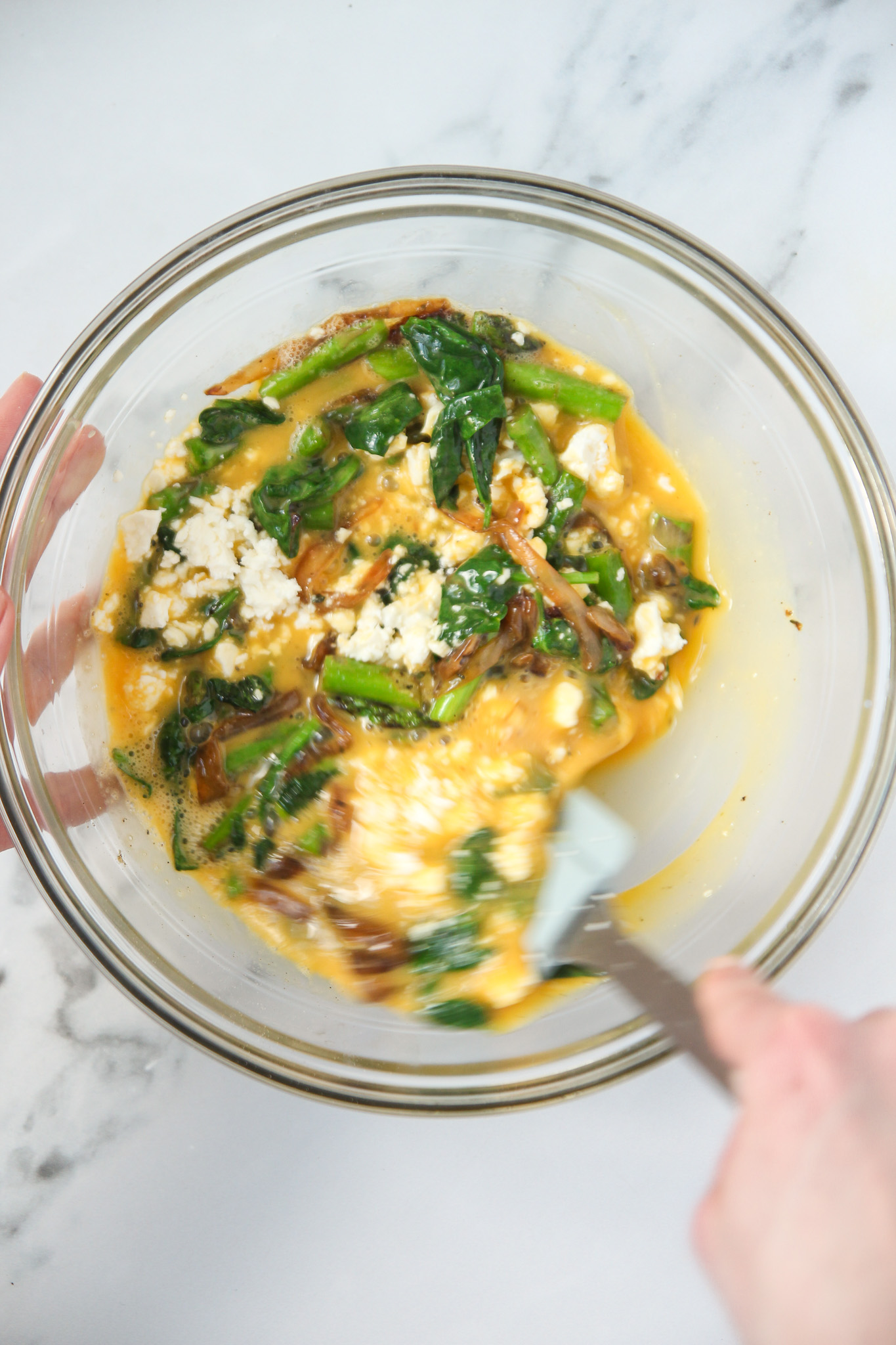 Crack the eggs into a medium mixing bowl. Whisk together with the milk, sea salt, and fresh black pepper. Fold in the cooked vegetables and crumbled feta.